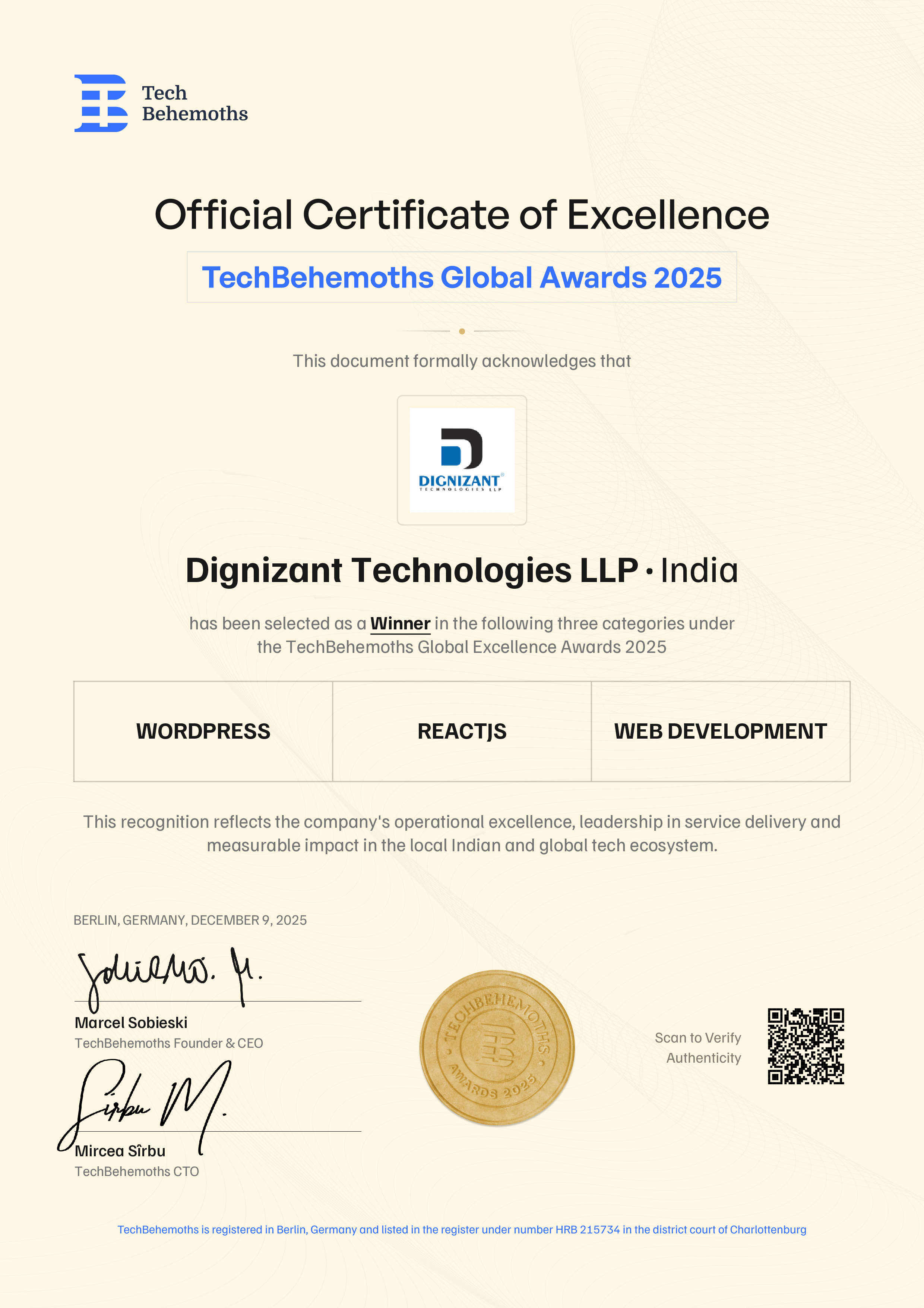 TechBehemoths officially certifies Dignizant Technologies LLP's 2025 Award achievement across the following service categories in India: