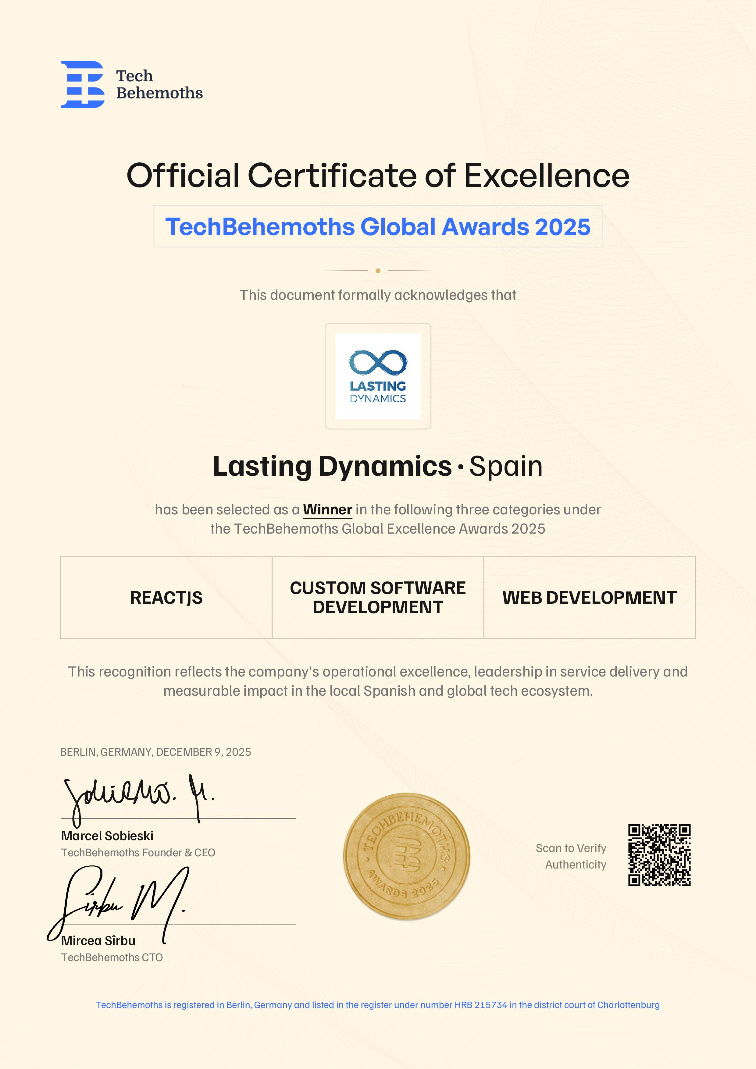 TechBehemoths officially certifies Lasting Dynamics' 2025 Award achievement across the following service categories in Spain: