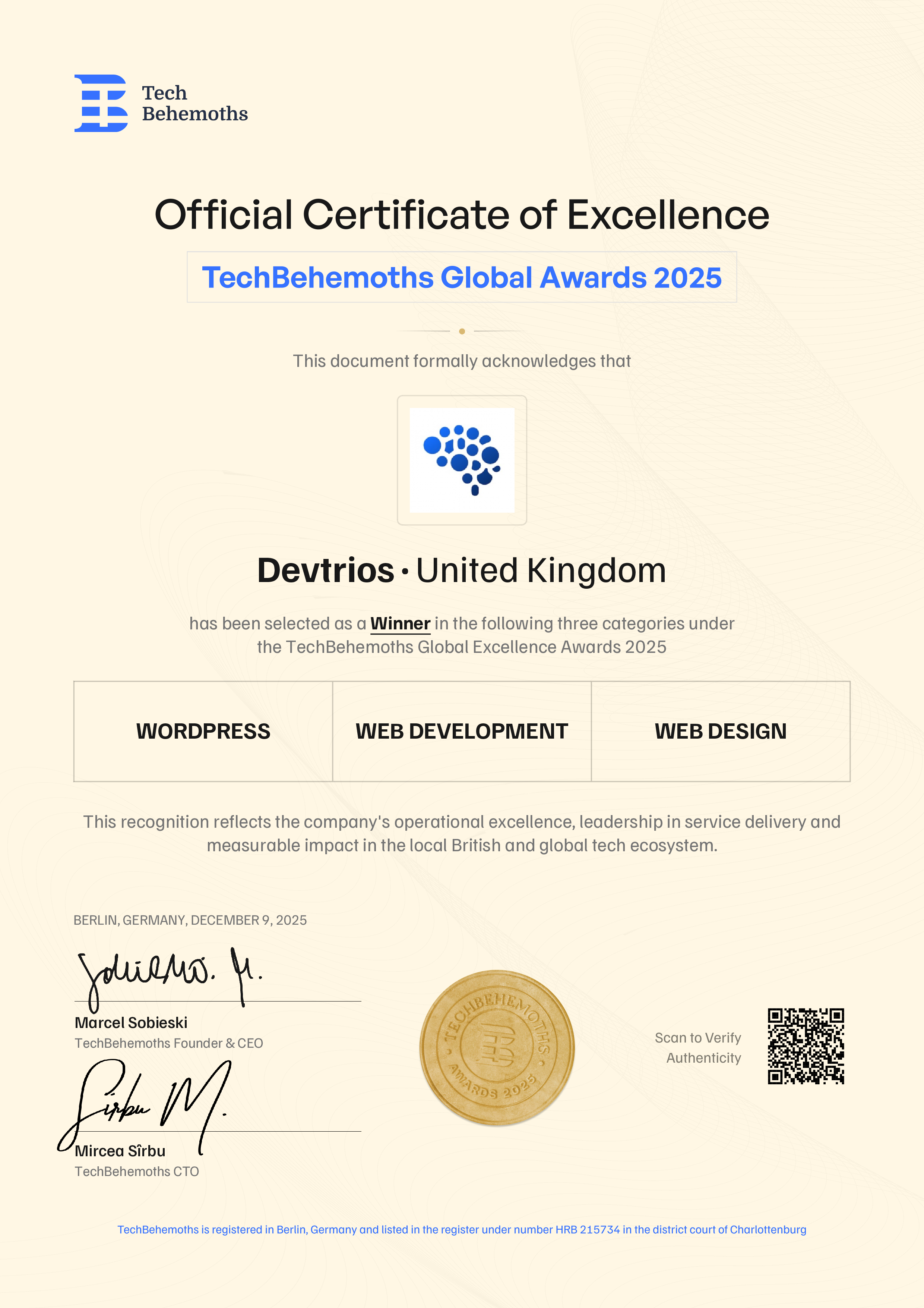 TechBehemoths officially certifies Devtrios' 2025 Award achievement across the following service categories in the United Kingdom:
