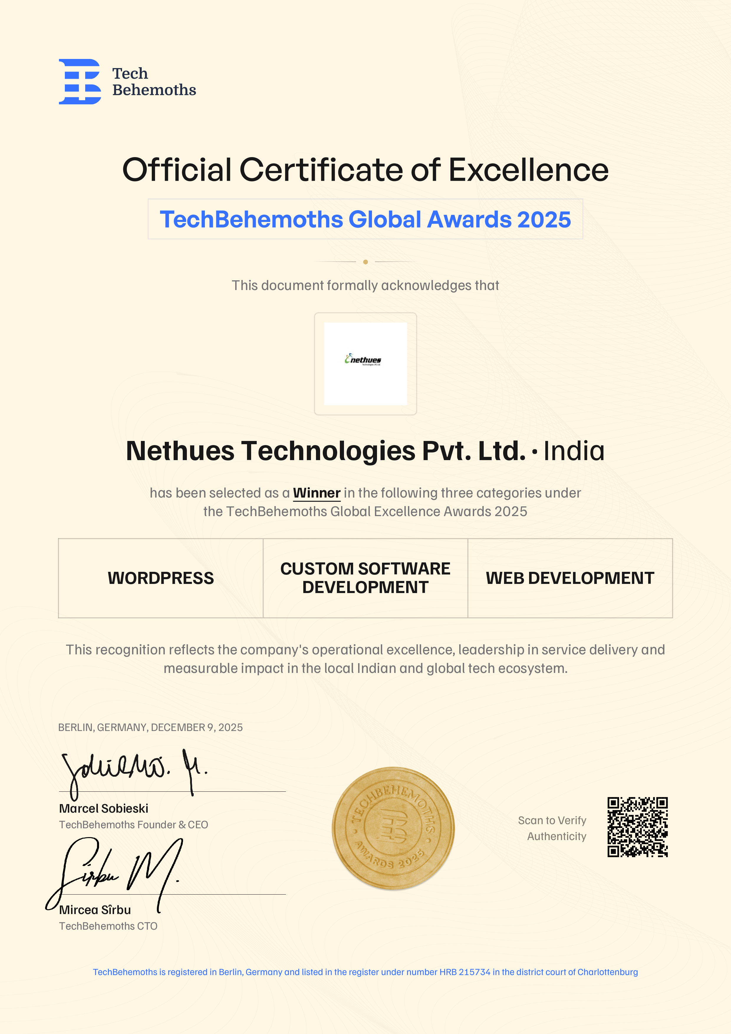 TechBehemoths officially certifies Nethues Technologies Pvt. Ltd.'s 2025 Award achievement across the following service categories in India: