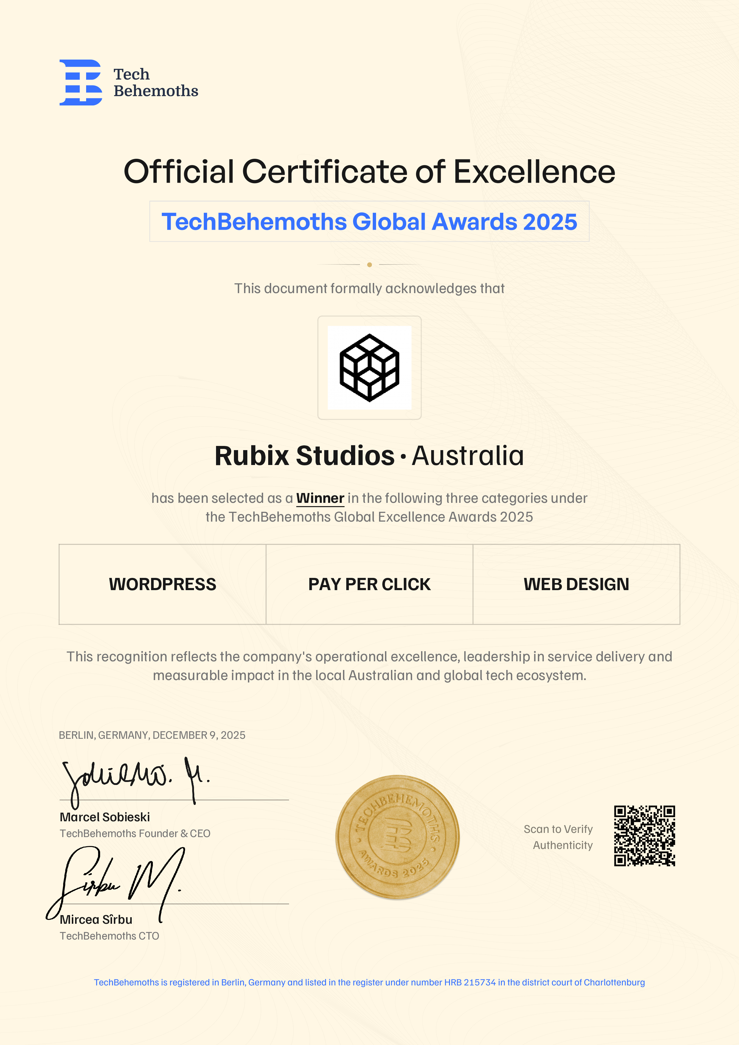 TechBehemoths officially certifies Rubix Studios' 2025 Award achievement across the following service categories in Australia: