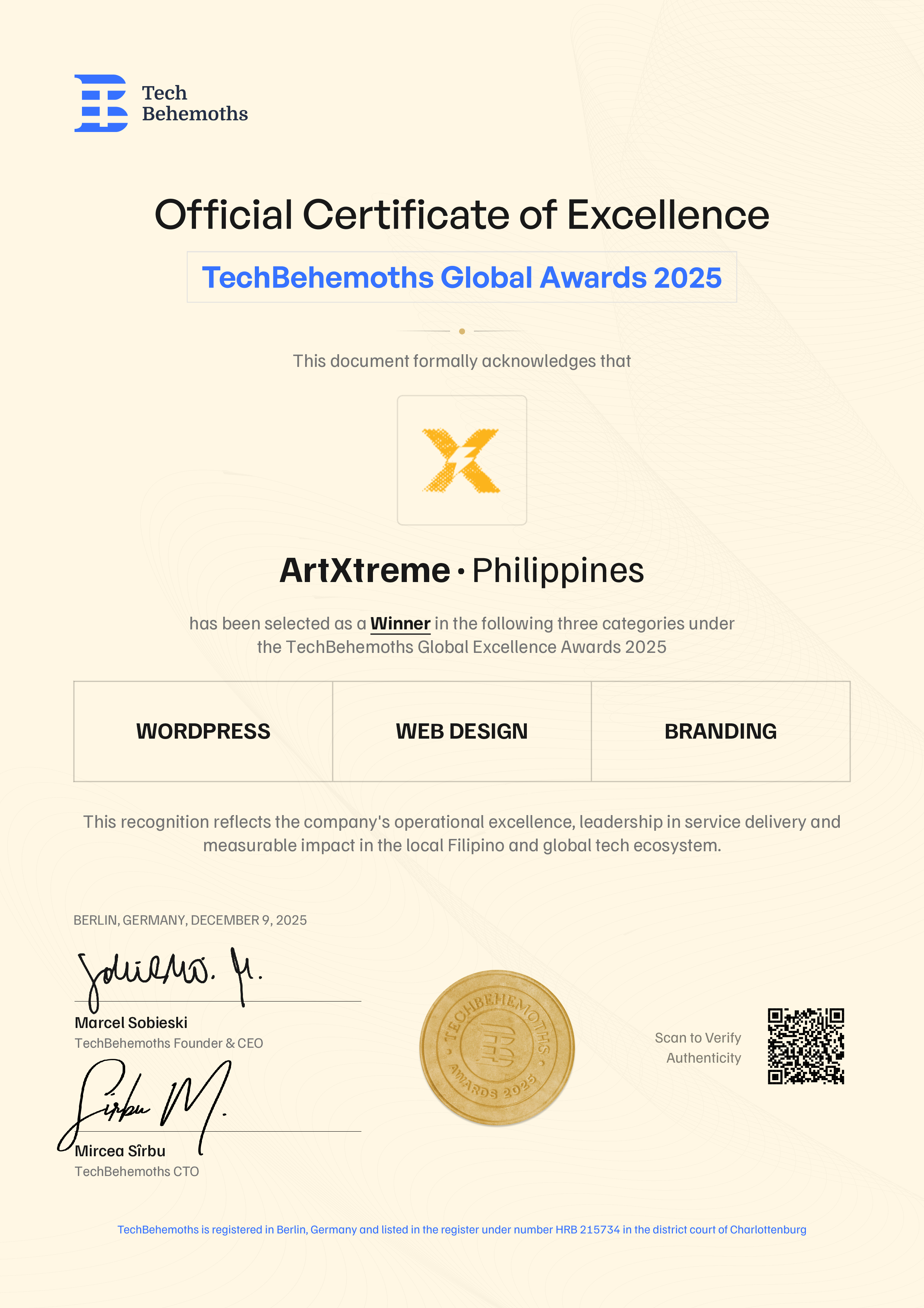 TechBehemoths officially certifies ArtXtreme's 2025 Award achievement across the following service categories in the Philippines: