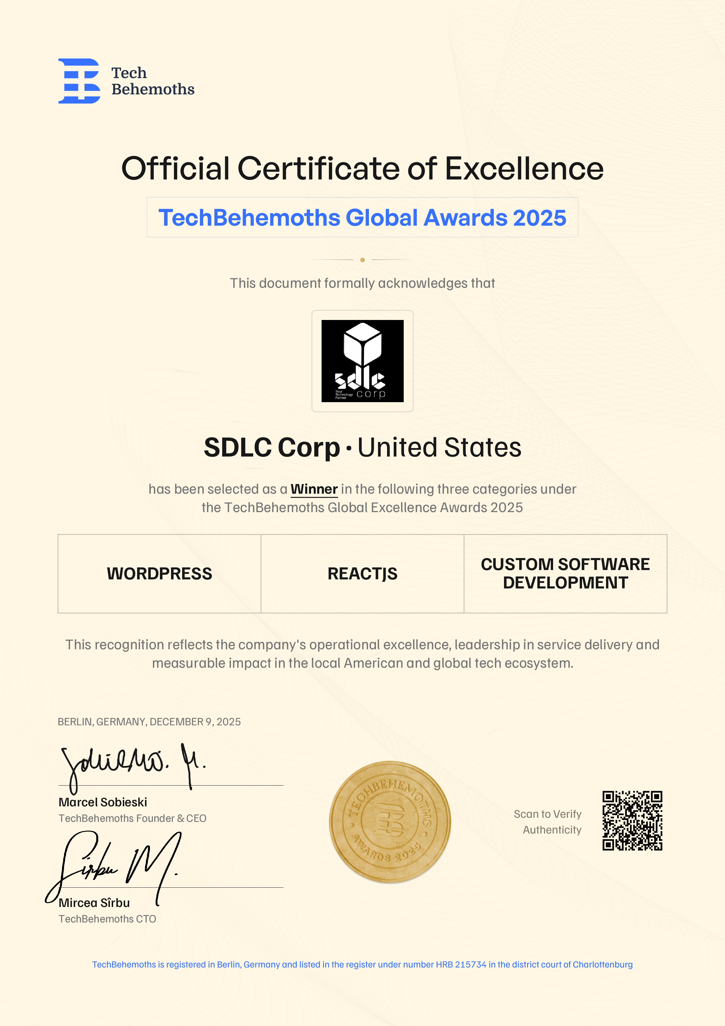 TechBehemoths officially certifies SDLC Corp's 2025 Award achievement across the following service categories in the United States: