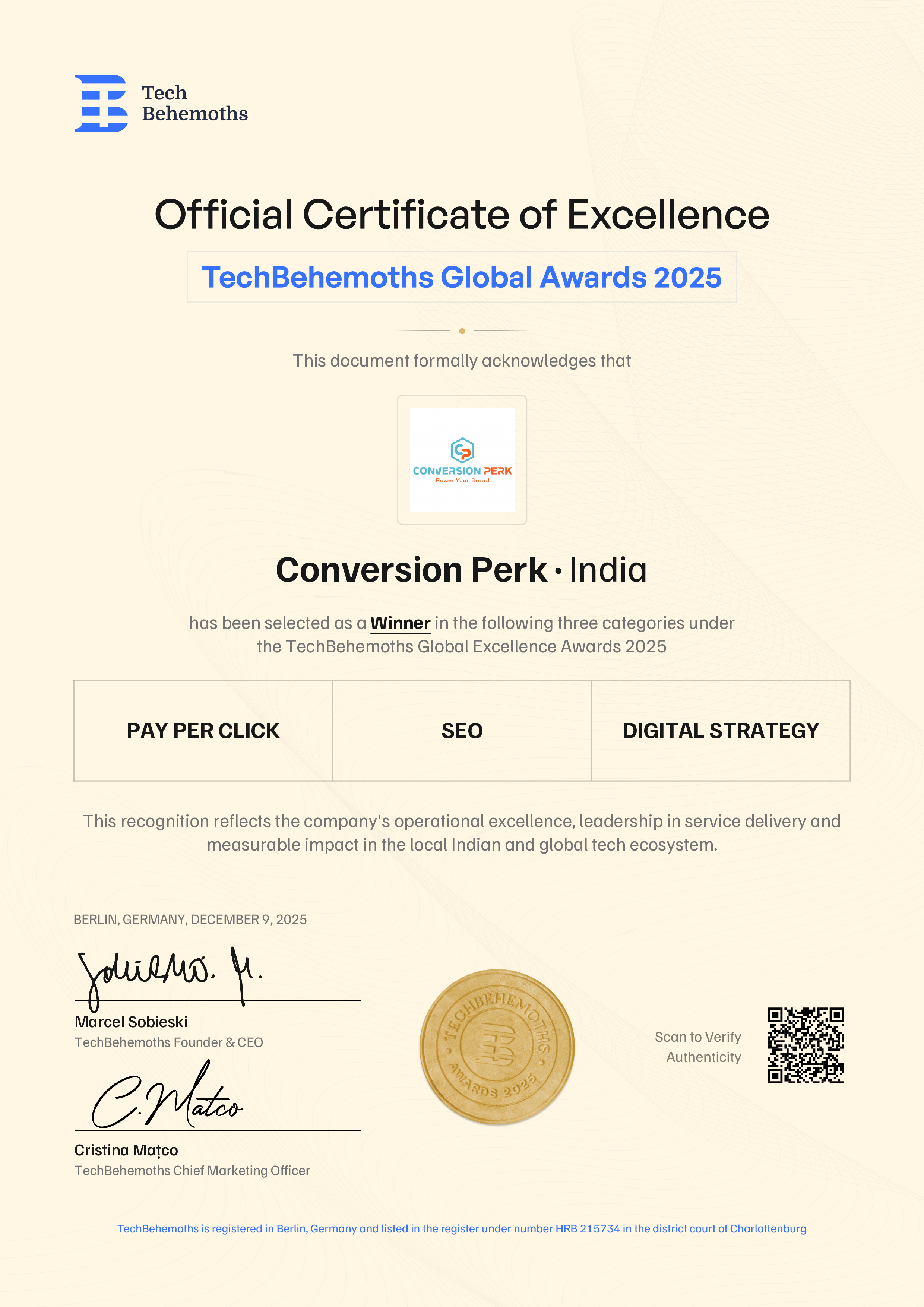 TechBehemoths officially certifies Conversion Perk's 2025 Award achievement across the following service categories in India: