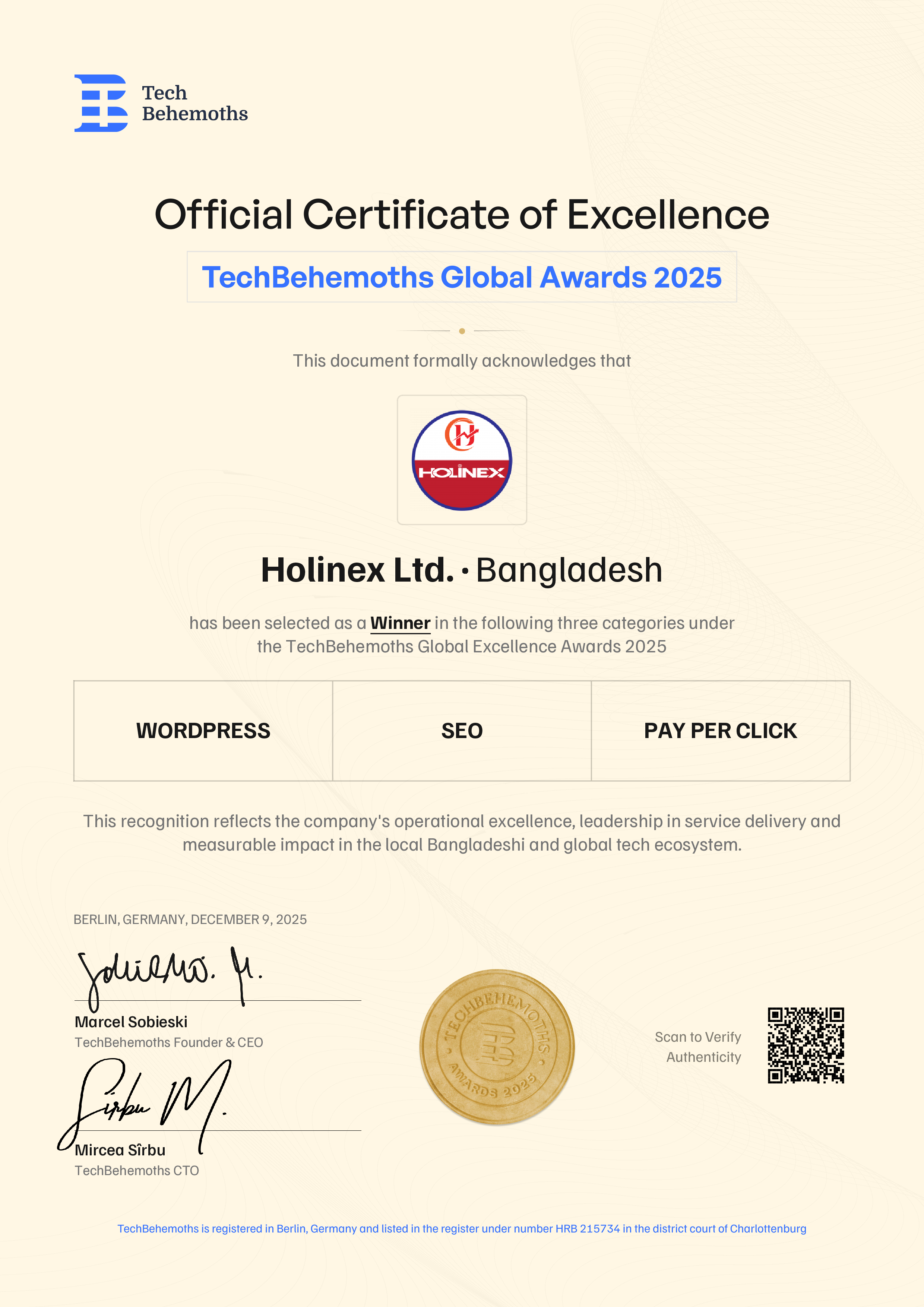TechBehemoths officially certifies Holinex Ltd.'s 2025 Award achievement across the following service categories in Bangladesh: