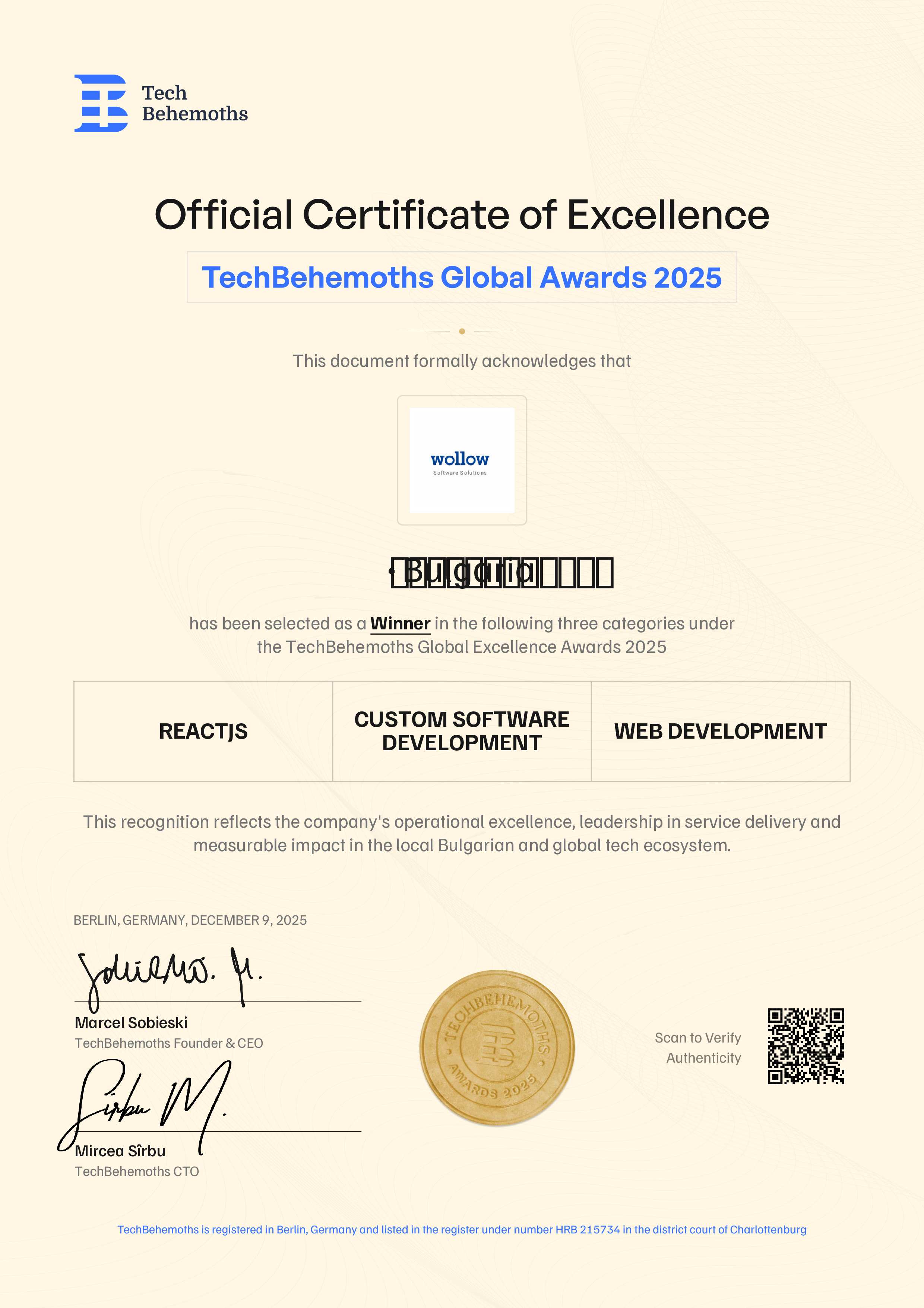 TechBehemoths officially certifies 𝖜𝖔𝖑𝖑𝖔𝖜's 2025 Award achievement across the following service categories in Bulgaria: