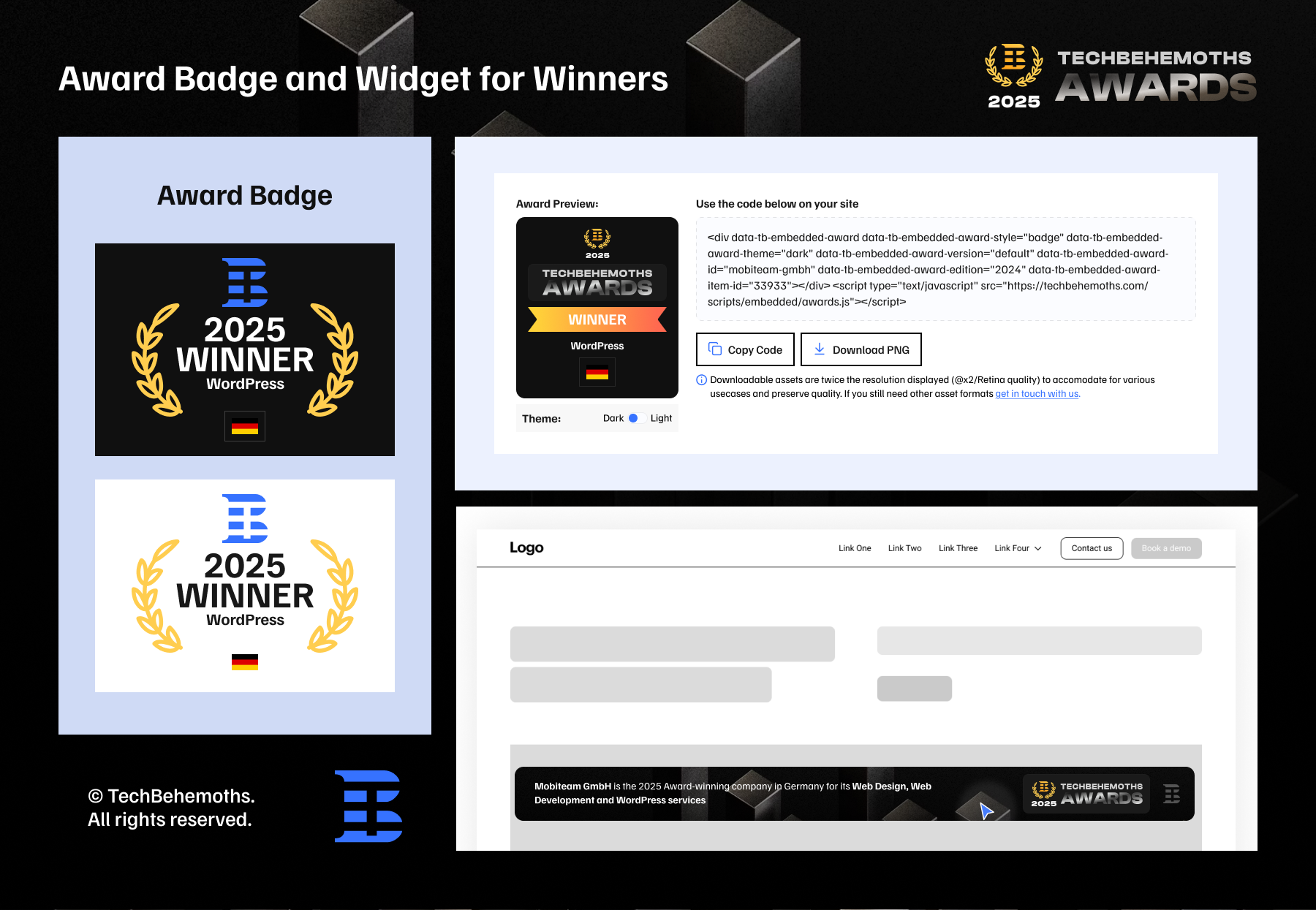 You can download all your official TechBehemoths Award badges in high resolution directly from your dashboard.