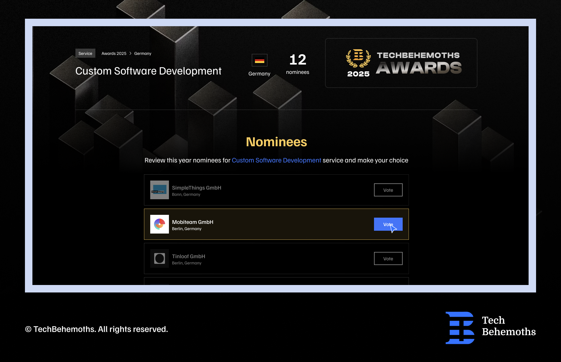 The TechBehemoths Awards are the first industry-wide award event fully driven by community voting. The voting phase begins right after the nominees are announced and runs until December 7, 2025.