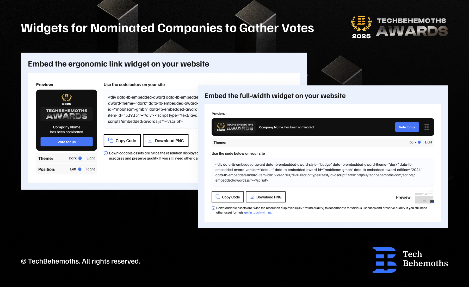 Each nominated company will have its voting widget displayed on its TechBehemoths profile throughout the entire voting period.