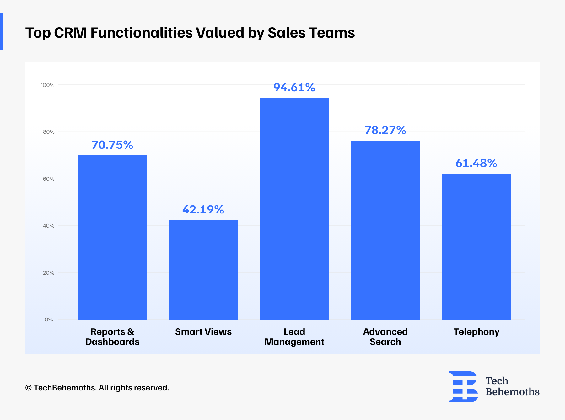 Over 3,000 users from sales departments who participated in a survey conducted by LeadSquared, the two most appreciated CRM functionalities by users were identified as: Lead management (managing potential customers) and Reporting (generating reports and analyses).