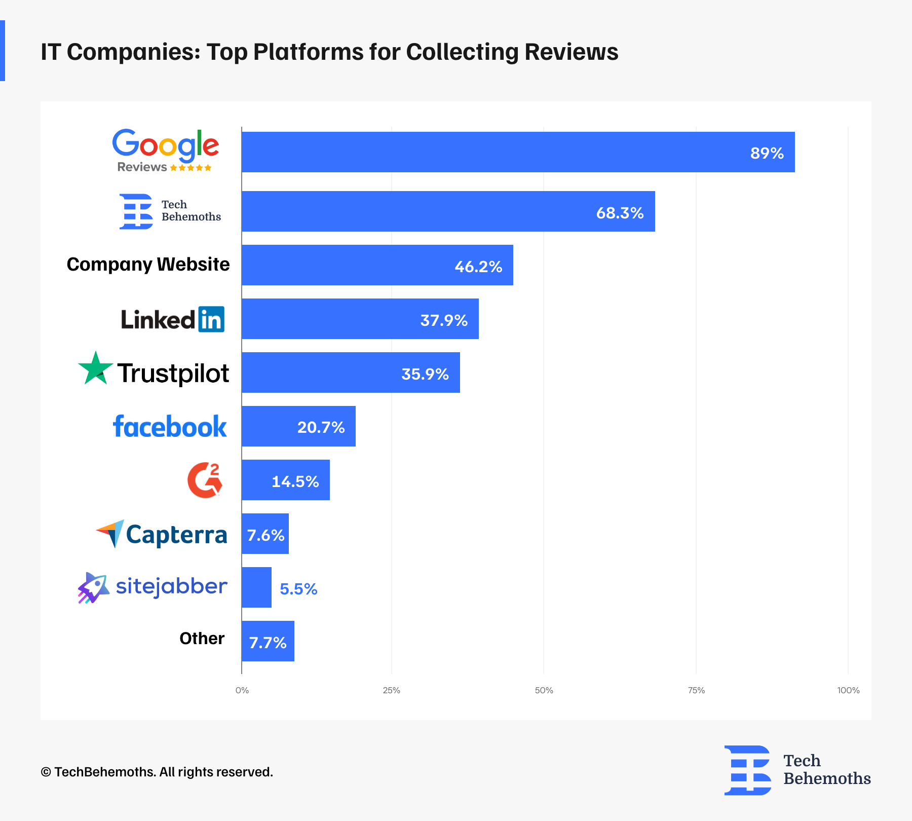 - Top review platforms: Google (89%), TechBehemoths (68.3%), company websites, LinkedIn, Trustpilot.