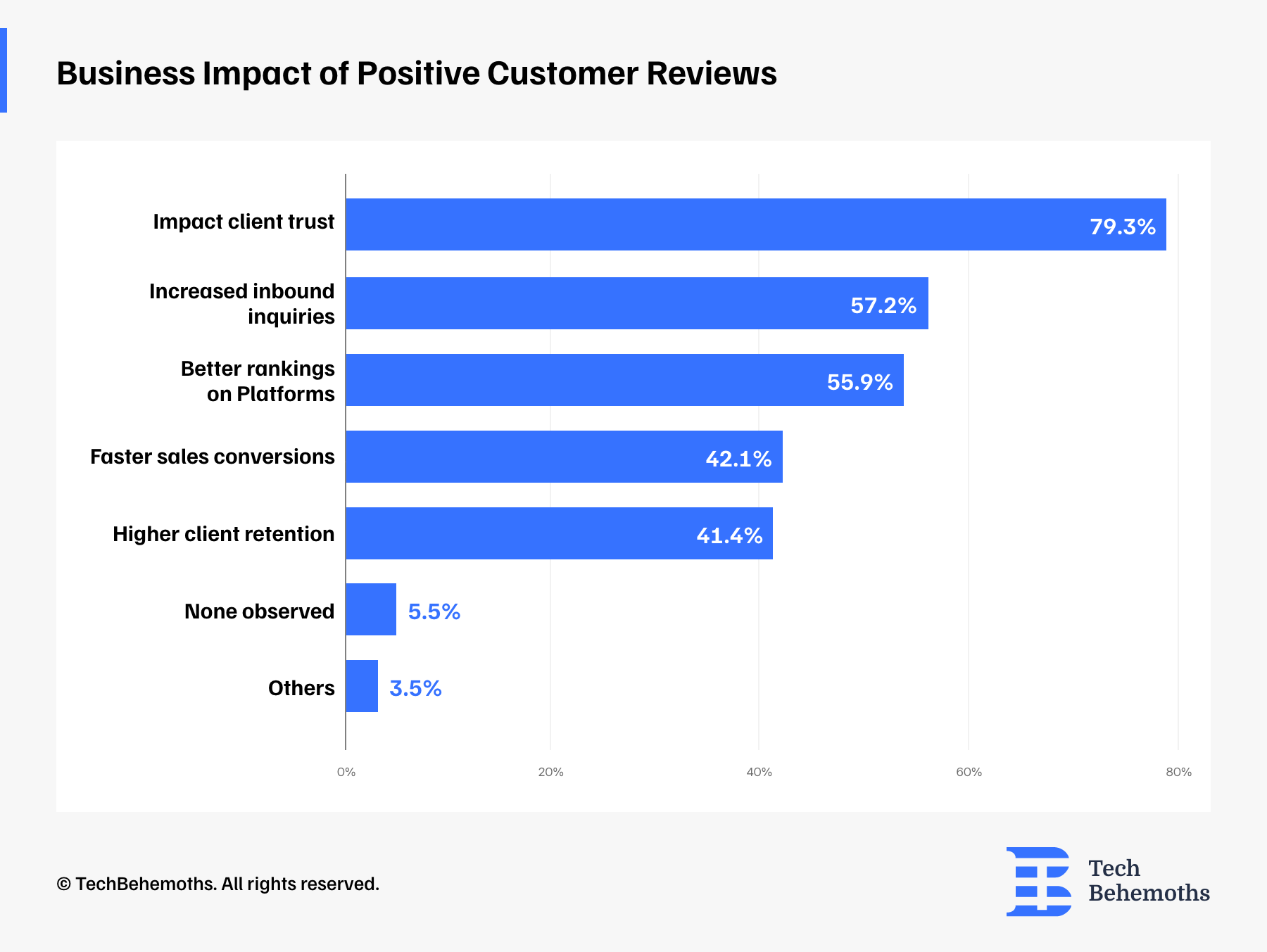 Positive customer reviews play an important role in a business’s success, influencing trust, brand reputation, and customer loyalty. According to TechBehemoths’ survey, IT companies experience clear, measurable benefits from reviews: