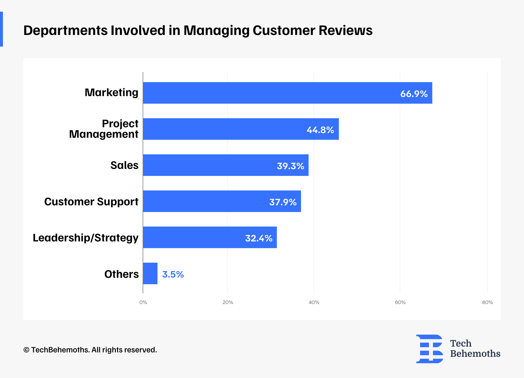 Managing customer reviews is becoming a cross-functional priority for IT companies. TechBehemoths’ survey shows that managing customer reviews involves multiple departments across IT companies:
