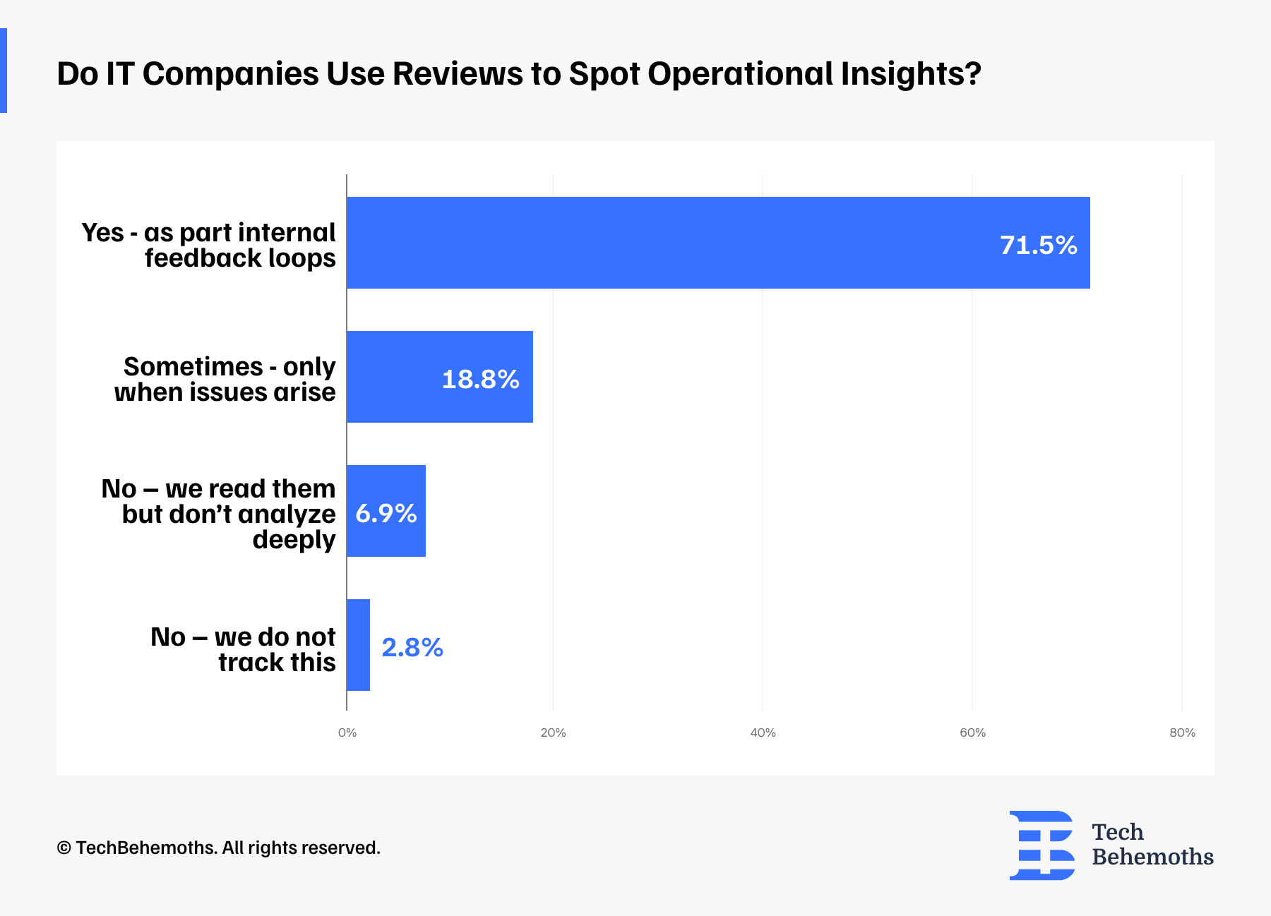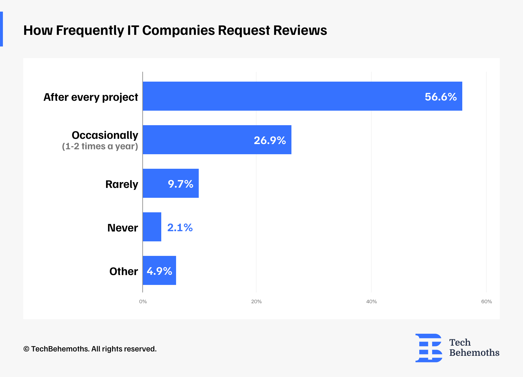 According to TechBehemoths’ survey, 56.6% of IT companies request reviews after every project, while 26.9% do so occasionally, and a small portion rarely or never ask for feedback.