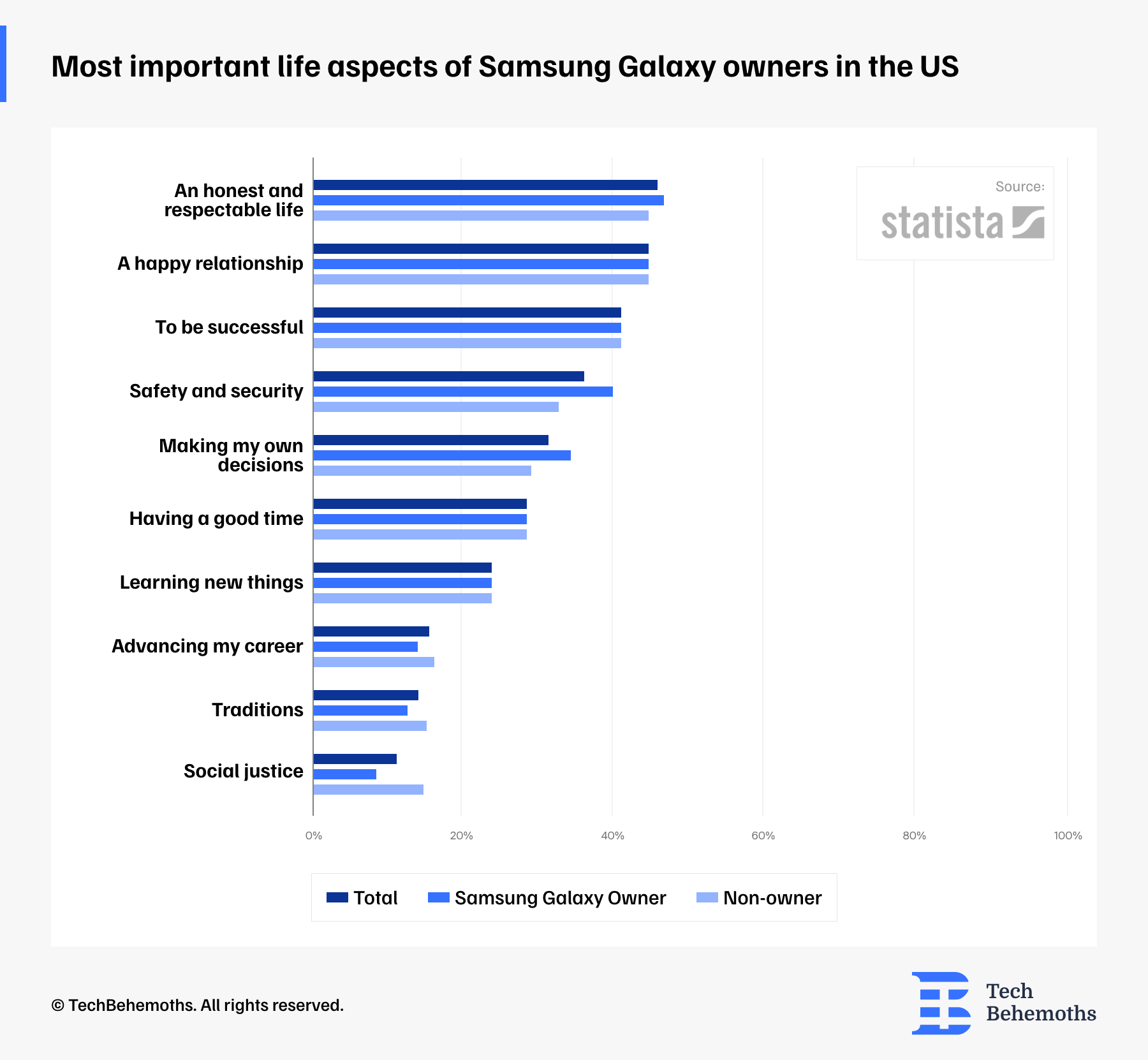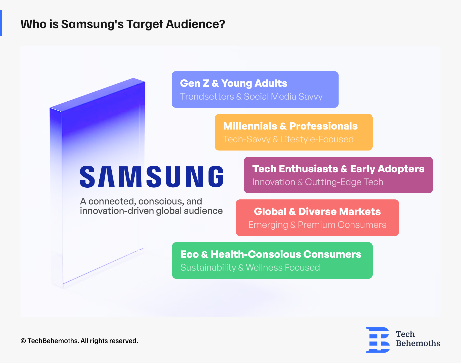 Samsung targets a wide range of users connected by technology, lifestyle, and ambition.