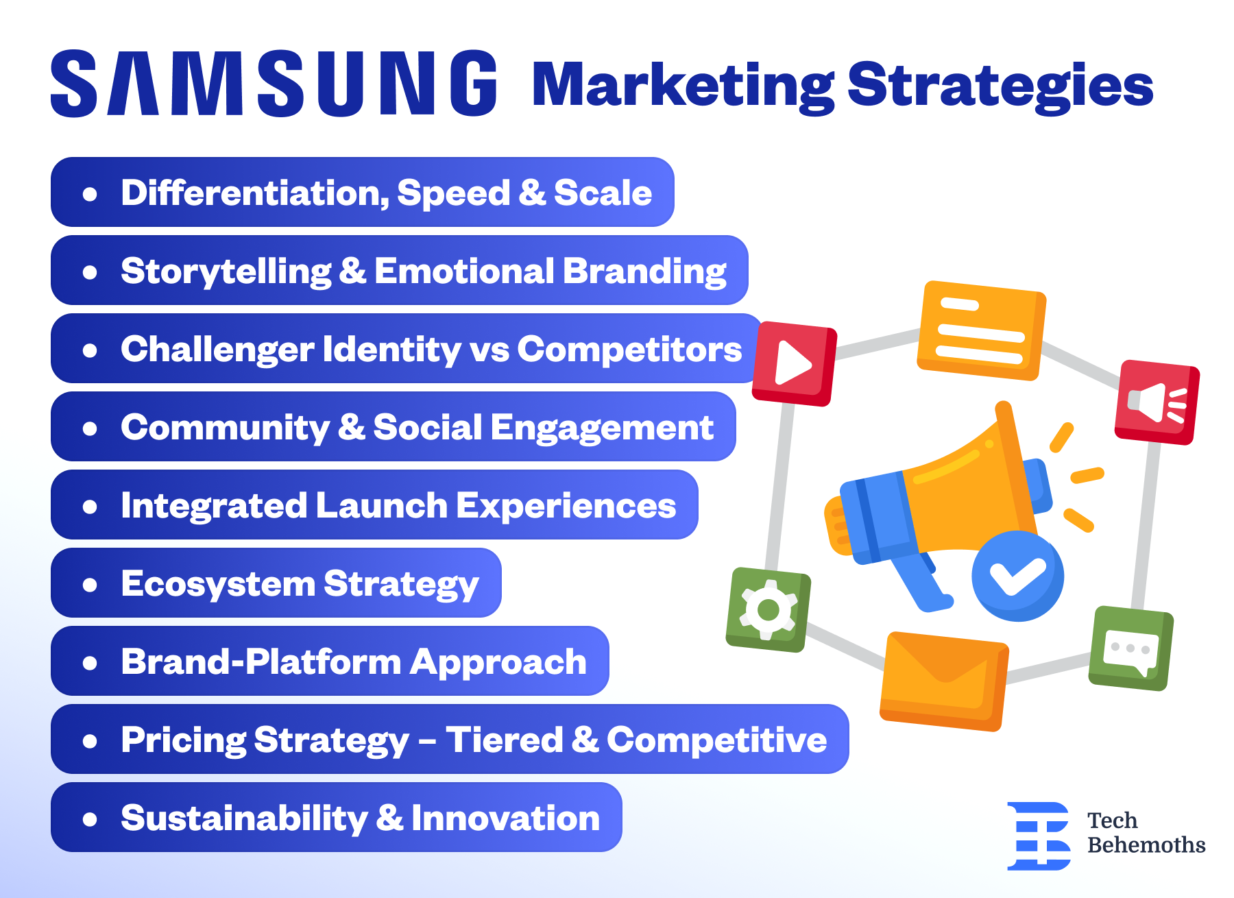 This way, Samsung uses a challenger strategy when facing direct competitors, a brand-platform strategy, and an ecosystem strategy, connecting smartphones, wearables, and smart home products under one experience.,