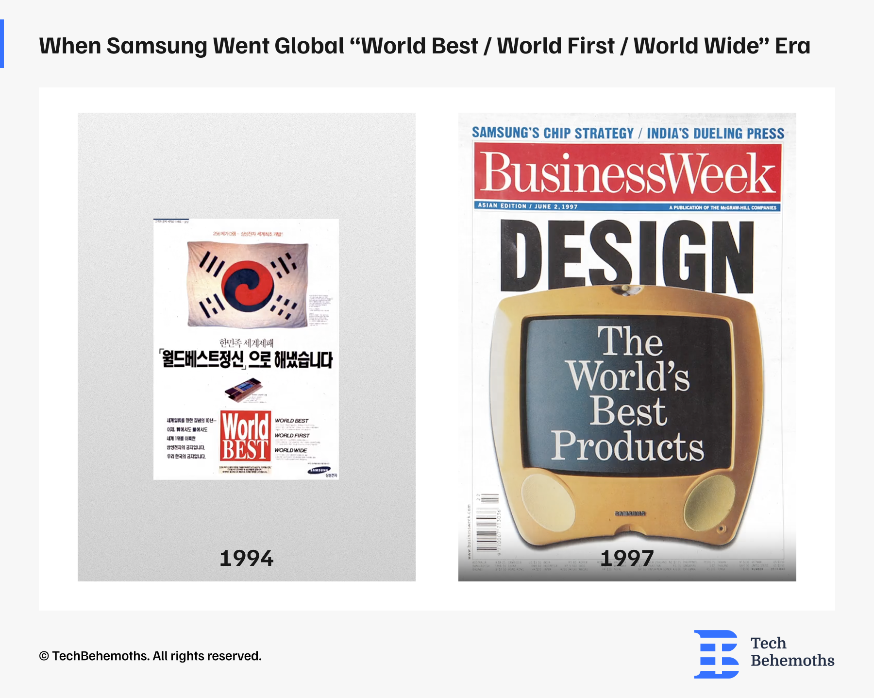 In the early 1990s, Samsung set a global ambition and launched "World Best / World First / World Wide" campaign, a strategic branding effort that conveyed the company's message that Samsung was not just a Korean company, but aimed to become a global leader in technology.