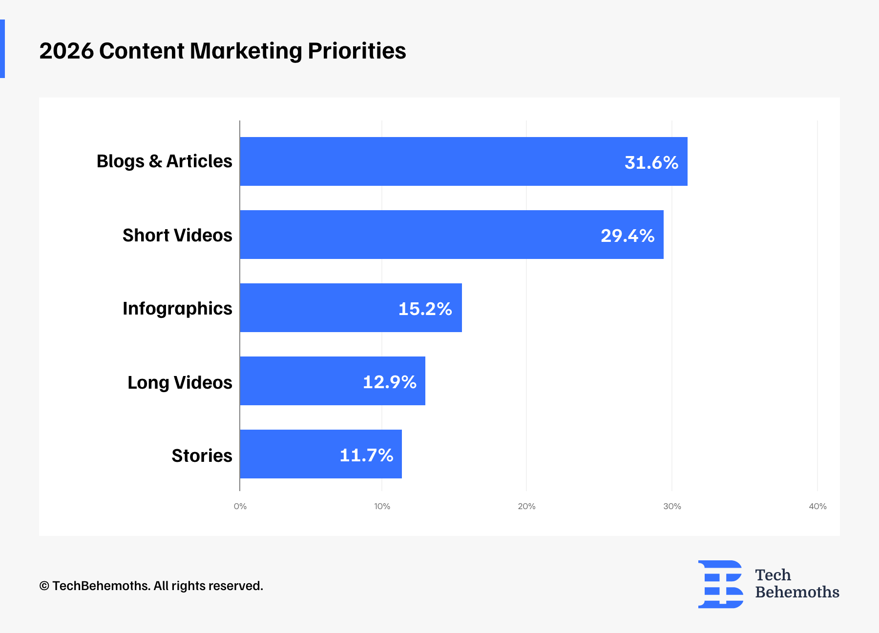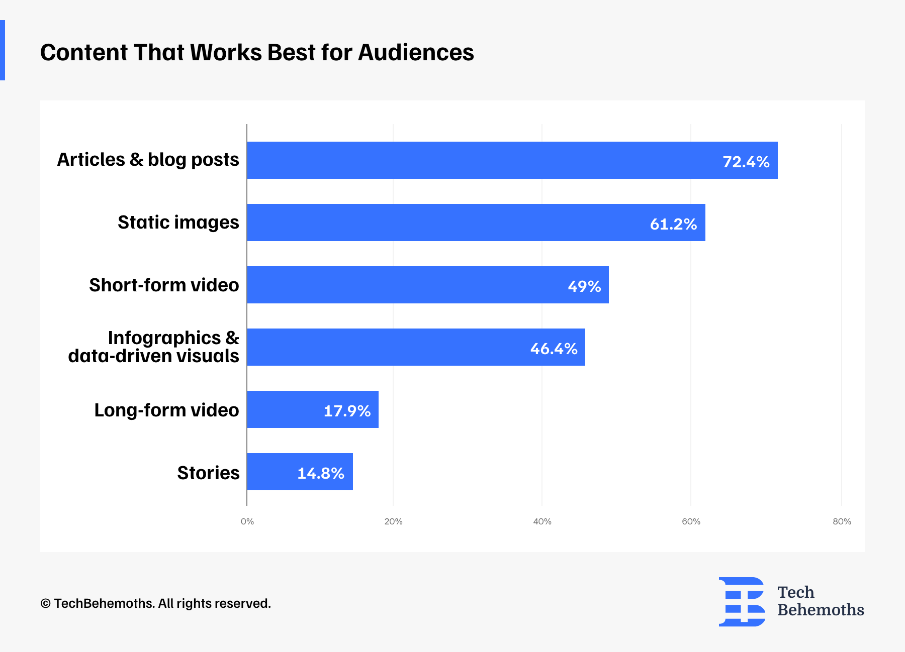 Static images follow at 61.2%, showing that simple visuals are a reliable way to grab attention and convey messages quickly. Nearly half of companies see strong results with short-form video (49%) and infographics (46.4%), as both provide engaging and easy-to-understand information.
