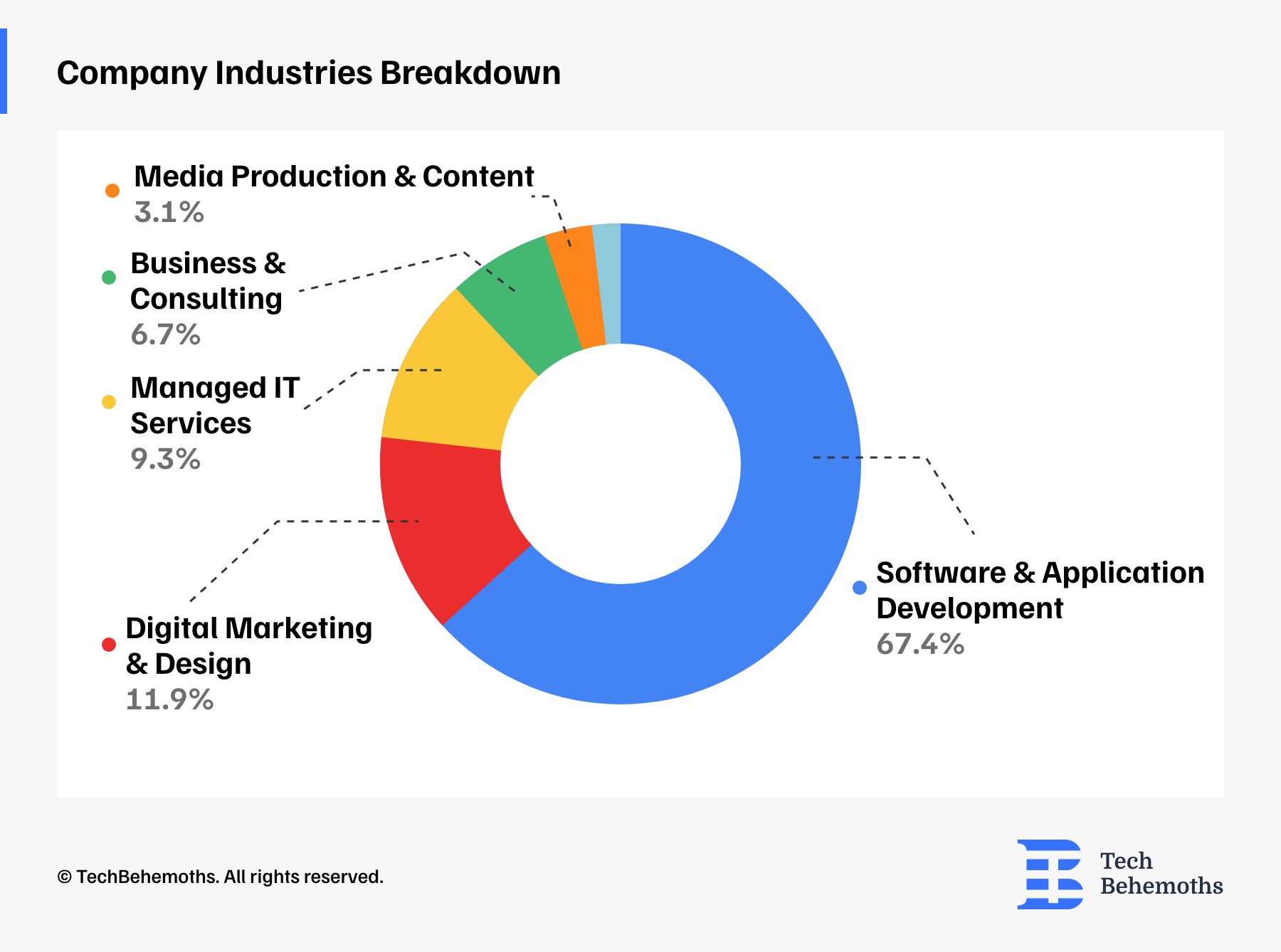 Nearly 7 in 10 respondents (68%) come from software and application development, showing how much digital-first industries rely on social media for visibility and getting clients. Companies in digital marketing and design (12%), IT services (9%), and consulting (7%) also have a notable presence, reflecting social media’s importance for brand positioning. Smaller shares from media production (3%) and niche industries (1.6%) highlight more specialized uses of digital channels.