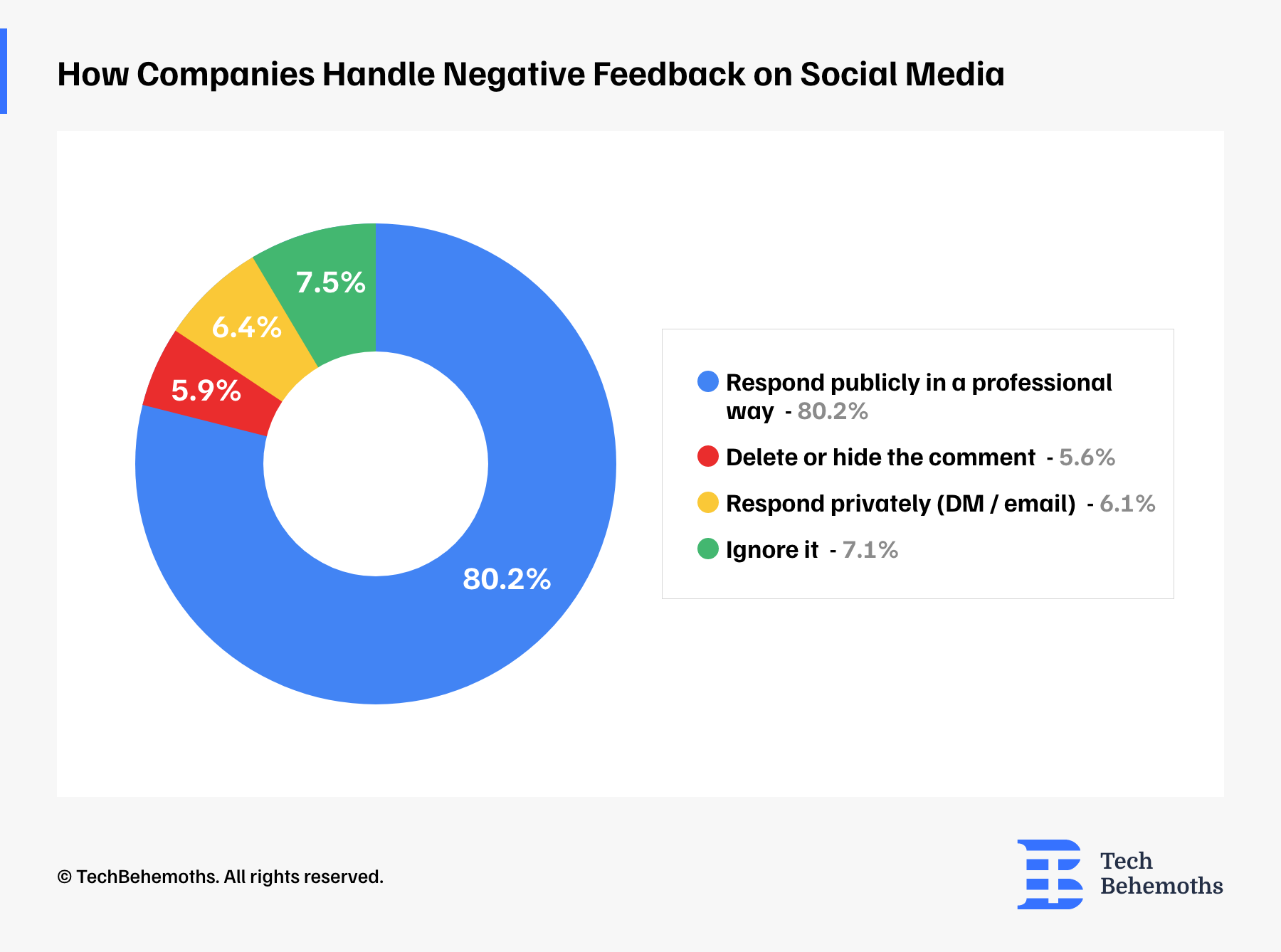 Some companies take a different approach: 7.1% ignore negative comments, while 5.6% delete or hide them. Thus, it is evident that most companies value public professionalism, considering it the best way to maintain trust.
