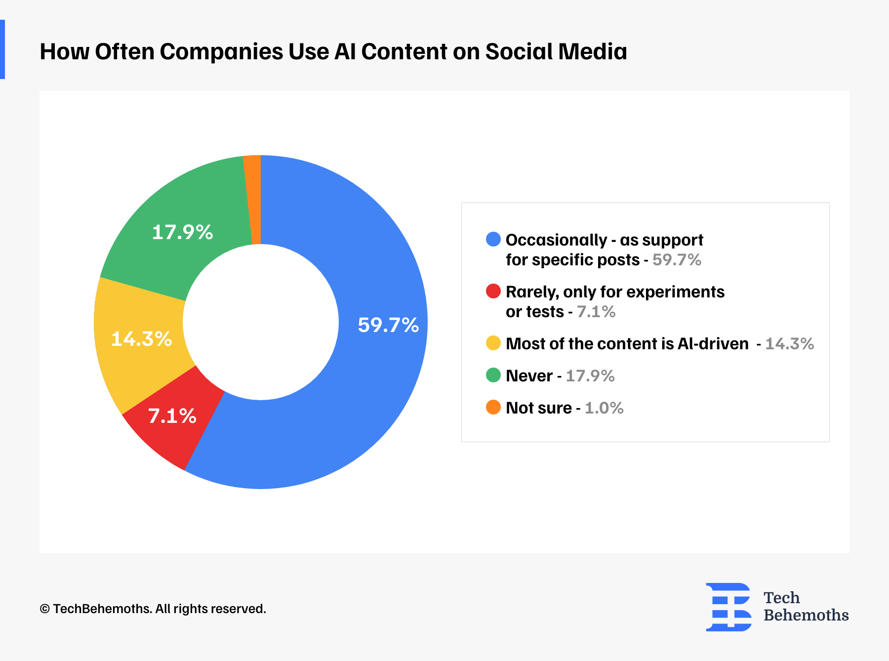 In response to the question of how often companies use AI Content on social, most (59.7%) reported using AI occasionally, mainly to support specific posts rather than as a primary content source.