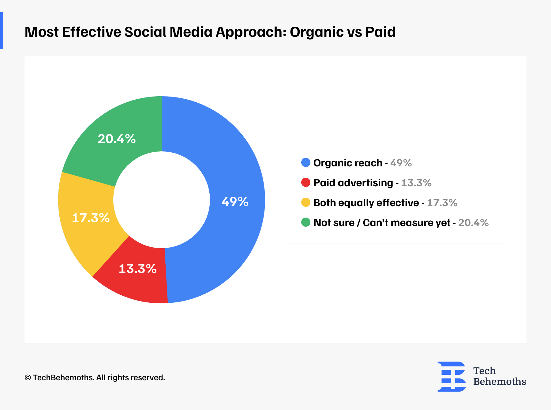 About 17.3% see both organic and paid approaches as equally effective, indicating that a combination works best for some businesses. Meanwhile, 20.4% are unsure or cannot measure effectiveness, highlighting the difficulty many have in tracking ROI and aligning social media efforts with business goals.