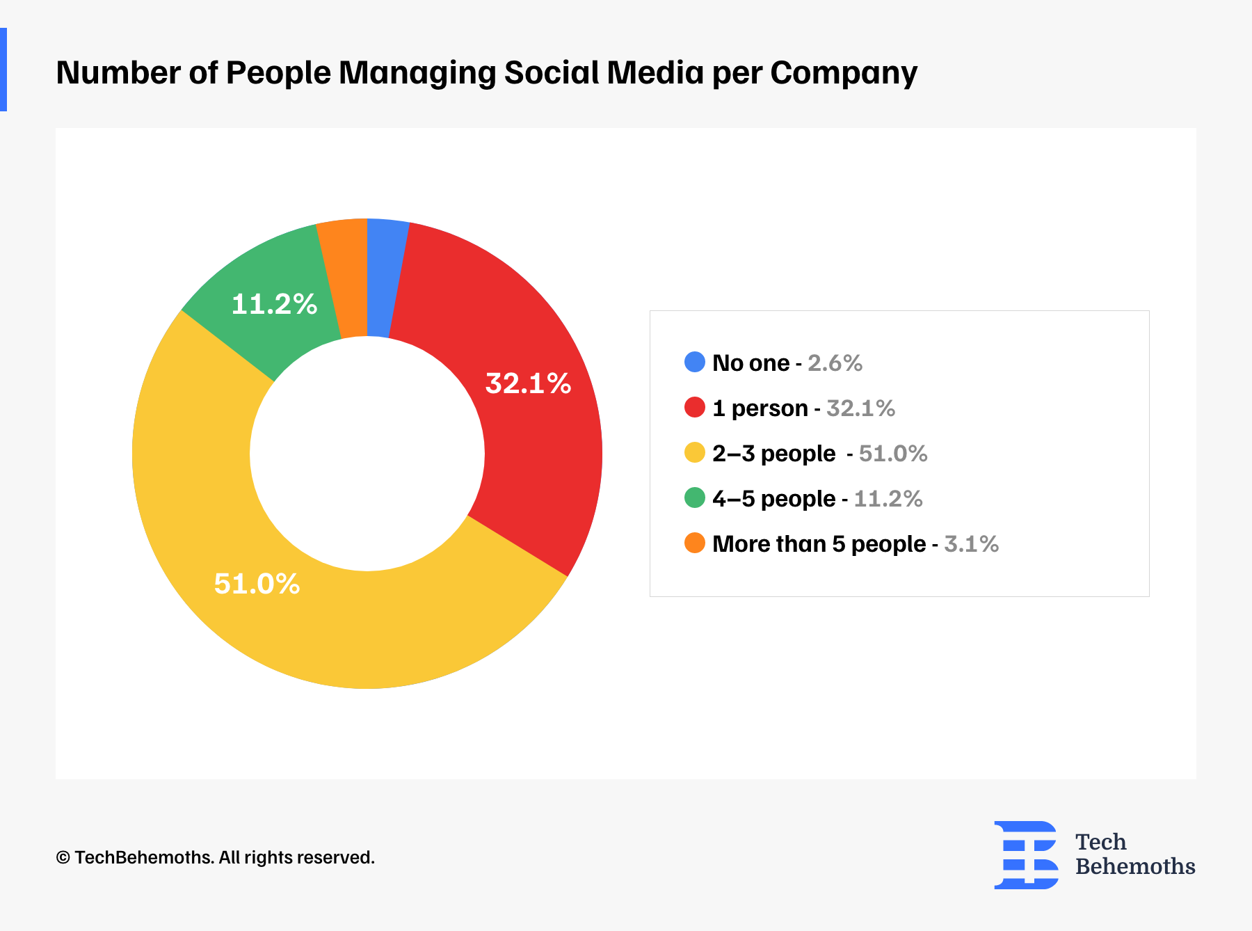 Larger teams, 11.2% involve 4–5 people, while only 3.1% have more than five. Notably, 2.6% of companies have no one managing social media, signaling missed opportunities in visibility.