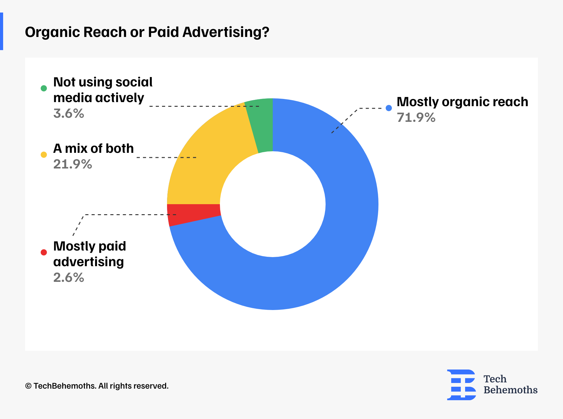 When asked about their approach to social media, 71.9% of respondents showed a clear preference for building visibility through content and engagement. Only 2.6% focus mainly on paid advertising, indicating that few see it as their primary strategy.