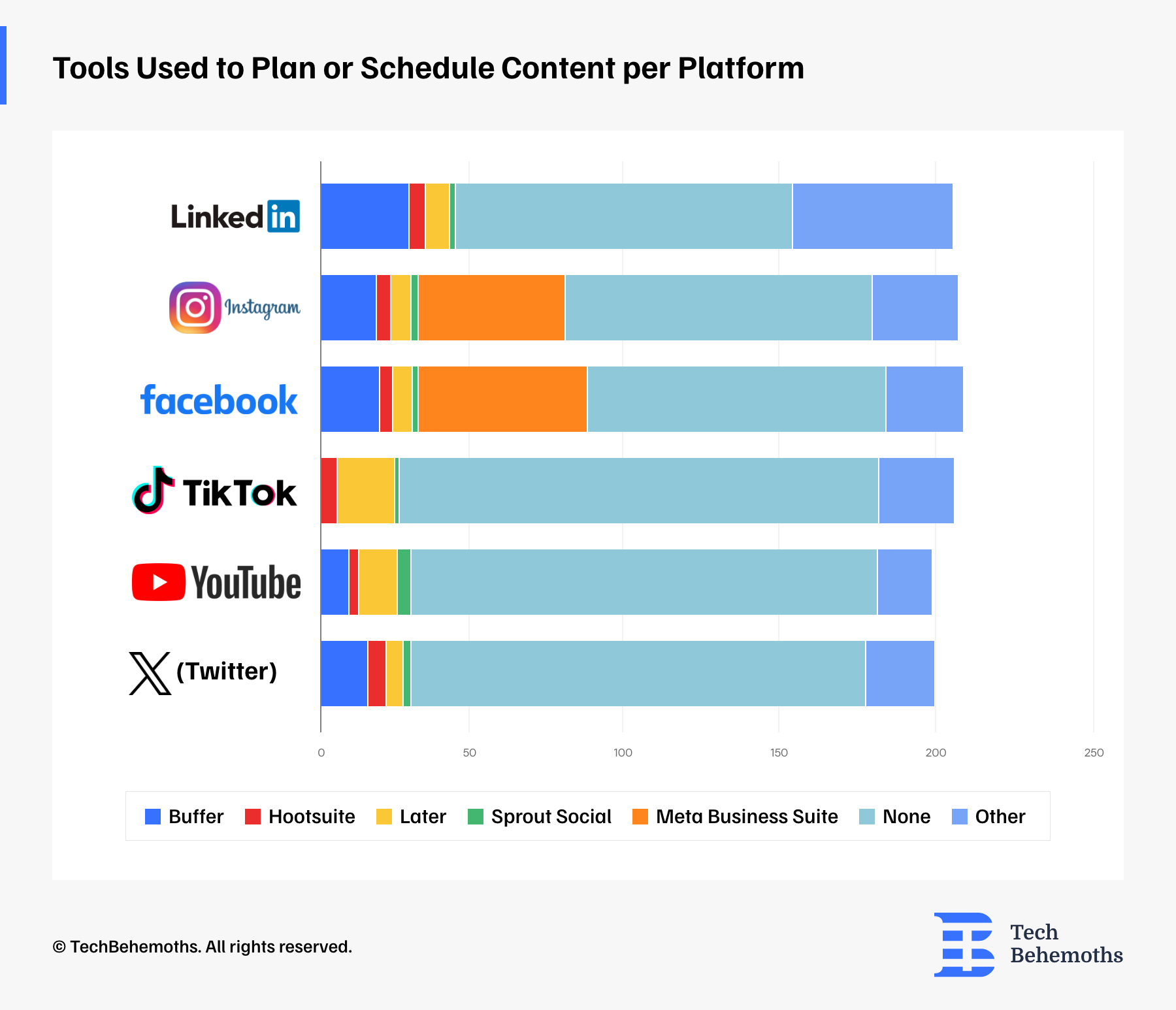 On X (Twitter), nearly three-quarters (74.9%) also manage content manually. Buffer is used by 7%, and other tools like Hootsuite and Sprout Social are used by 12.6%.