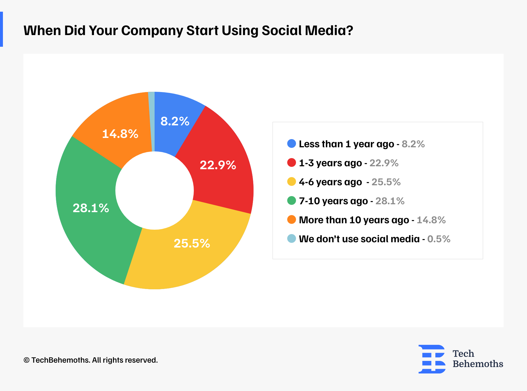 More than half (53.6%) started using social media between 4 and 10 years ago. This indicates that businesses began to adopt it more in the mid-2010s as it became essential for visibility.