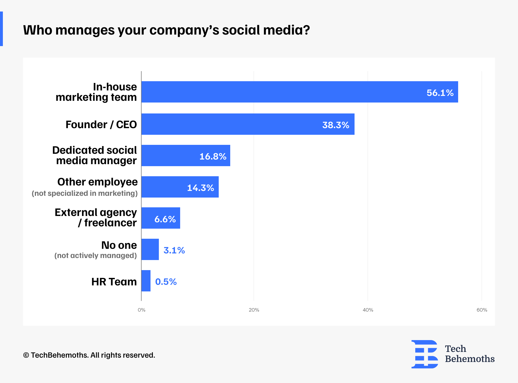 In response to the question of who manages company social media, 56.1% is handled by in-house marketing teams and 38.3% by founders or CEOs.