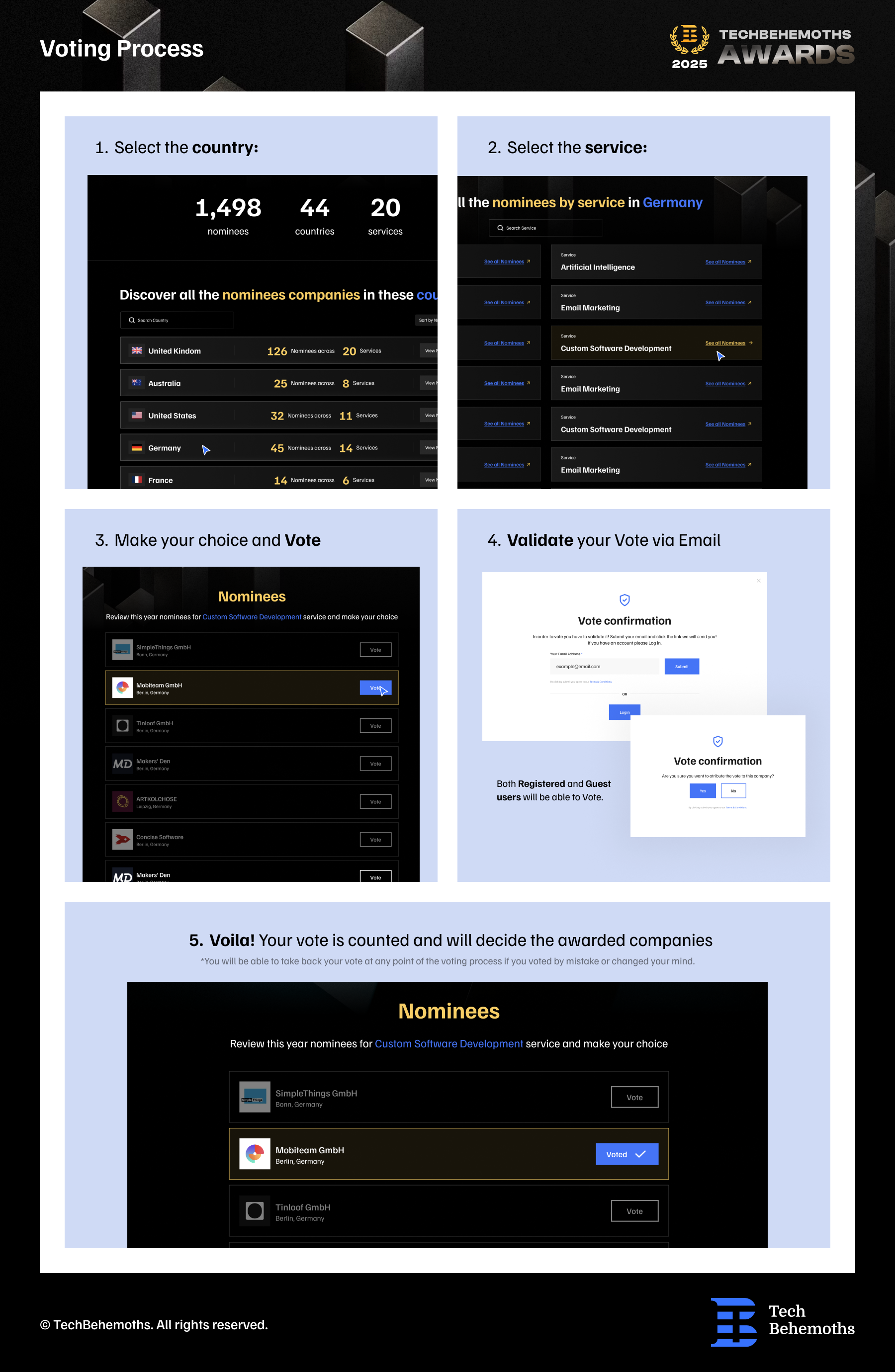 TechBehemoths also uses advanced protection methods like VPN and proxy detection, traffic filtering, and behaviour checks to block suspicious activity. This ensures that every vote reflects real support from real people, keeping the Awards transparent and trustworthy. To give you an idea, 47% of all reviews in 2025 were rejected and not approved. This is to keep our reputation and reliability high.