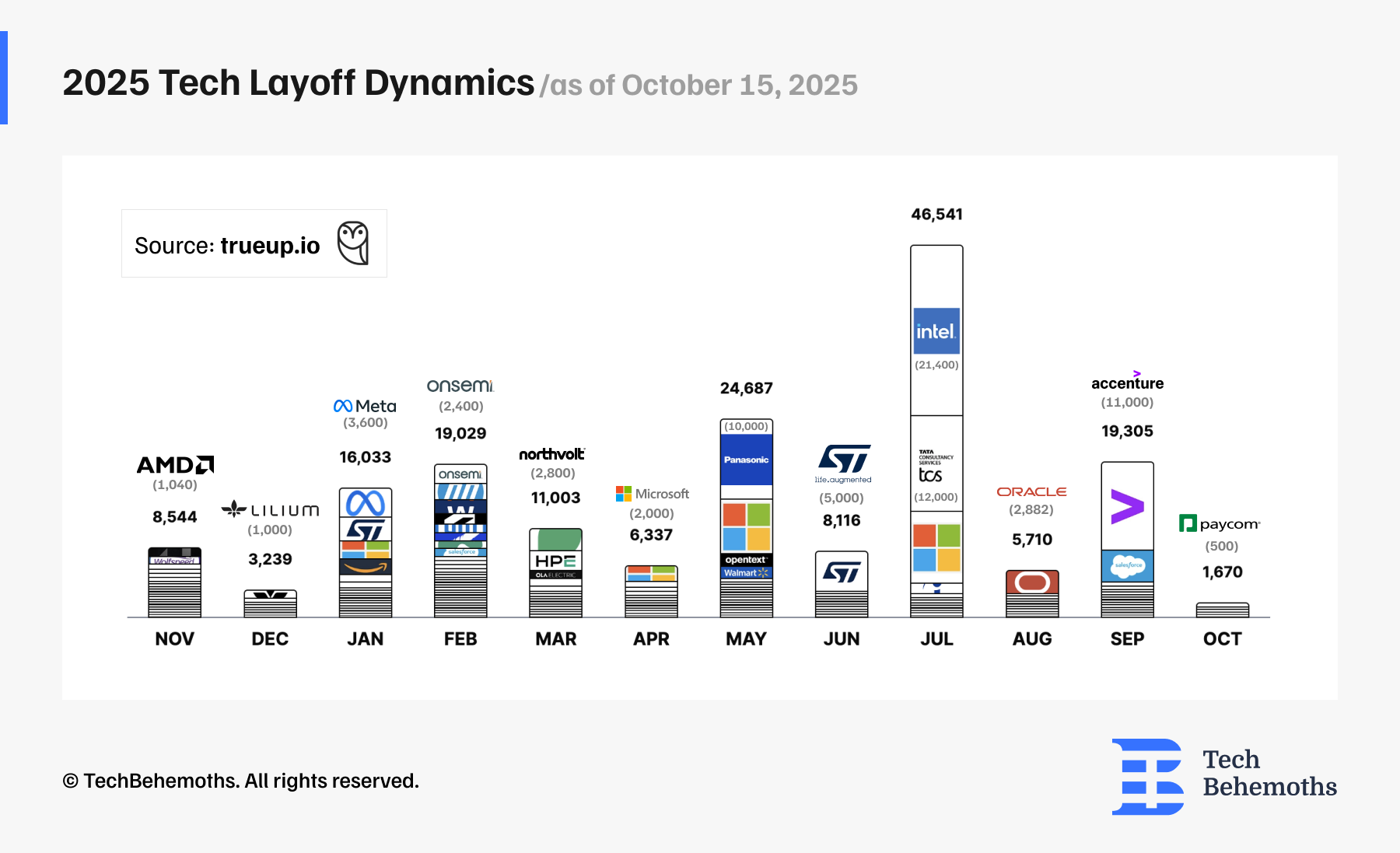 So far in October 2025, thousands of tech players have watched a drastic, explainable - but difficult to accept - phenomenon in which a wave of layoffs has occurred, with approximately 157,000 employees laid off from over 544 companies in the technology sector, thus recording an average of 574 people laid off per day.