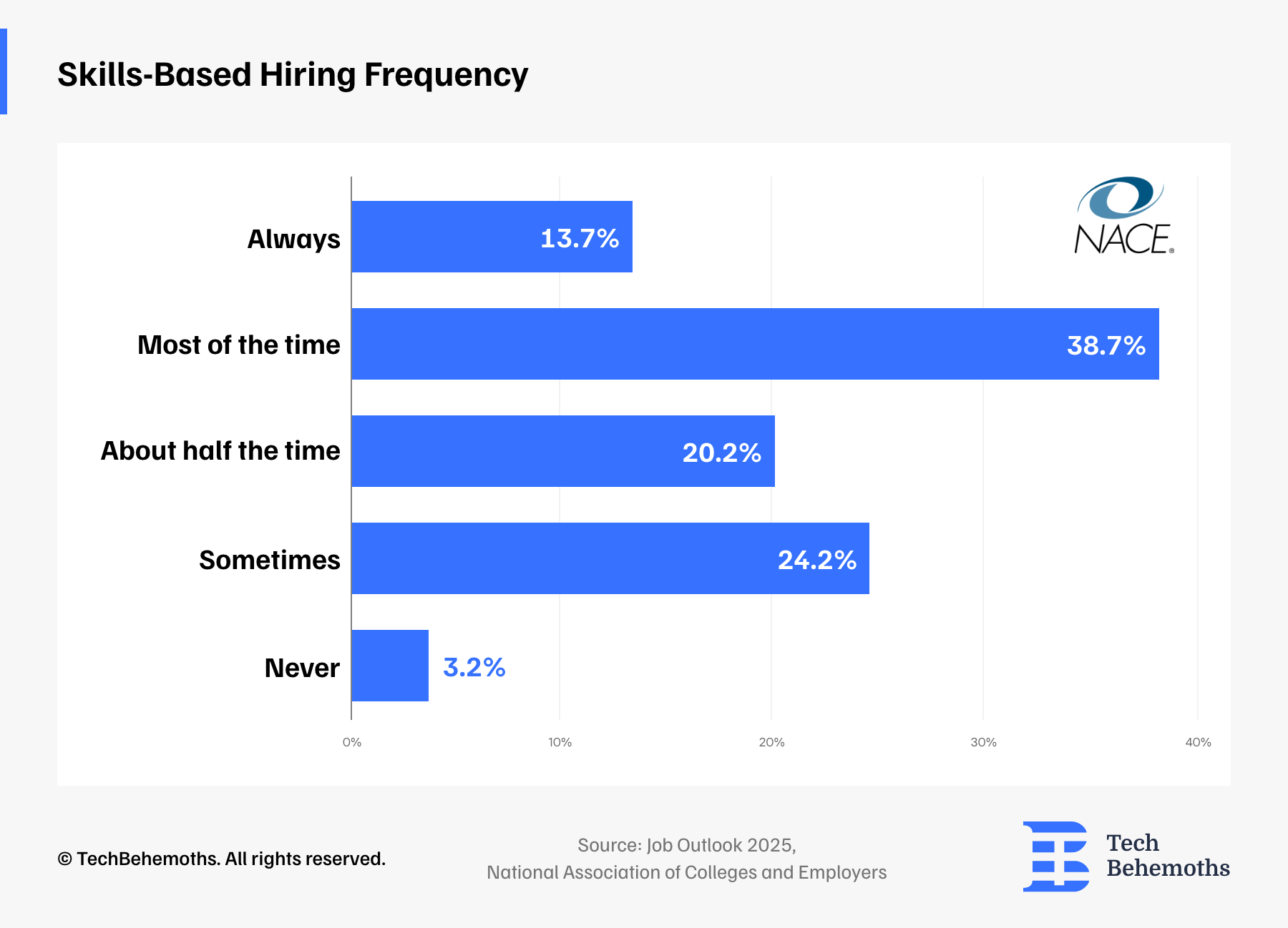 NACE reseach has documented that skill-based hiring practices appear to be relatively ubiquitous, with over half of employers using these practices always (13.7%) or most of the time (38.7%) in their hiring process.