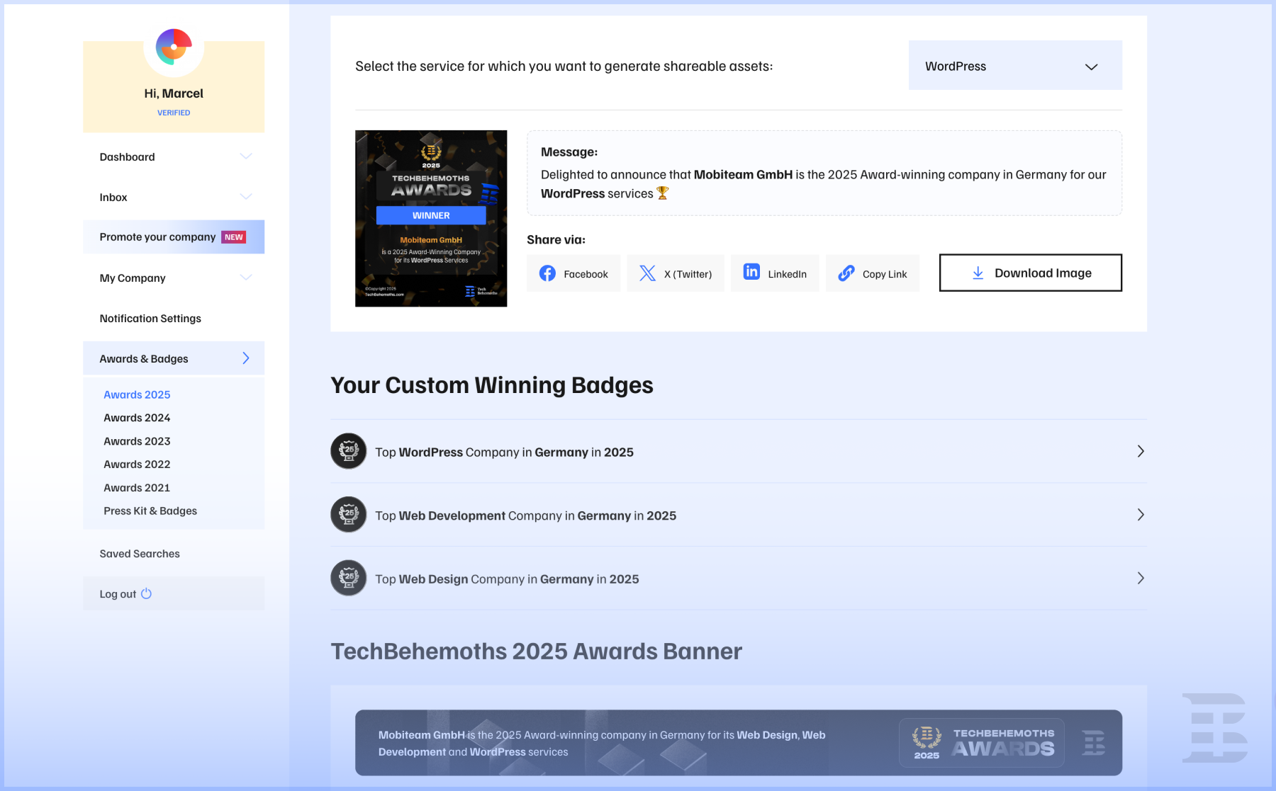 In addition to the Certificates of Excellence you can also celebrate your success with TechBehemoths badges and widgets. These assets can be easily downloaded from the Awards and Badges section in your dashboard, allowing you to share your recognition across websites, presentations, and social media.