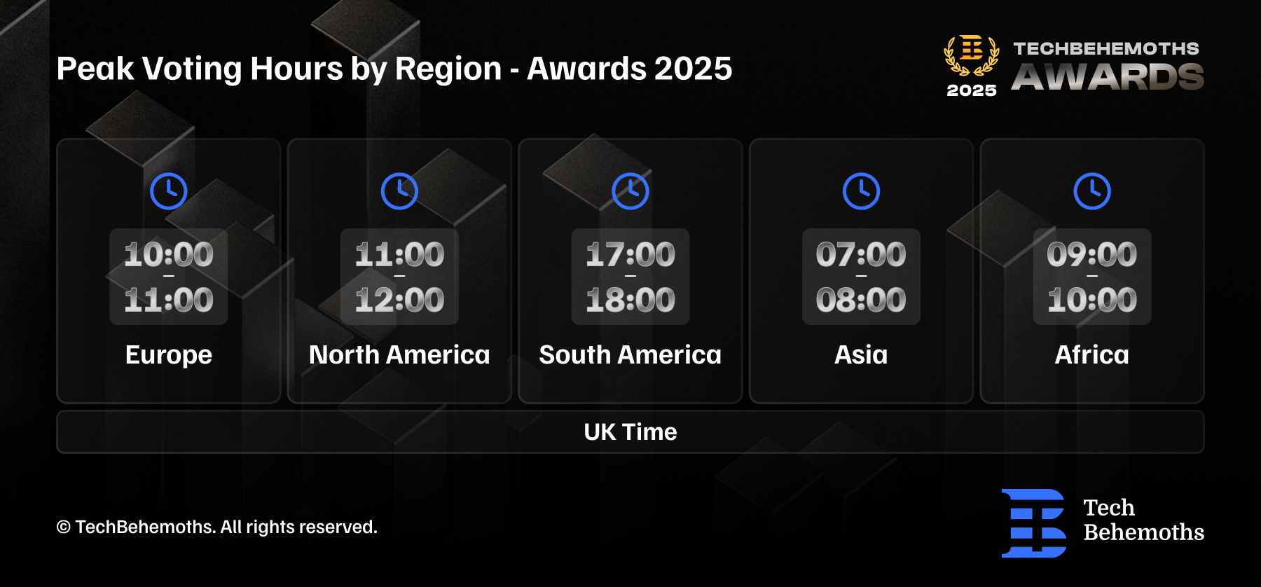 - Voting activity peaked at different hours across regions, all measured in UK time: