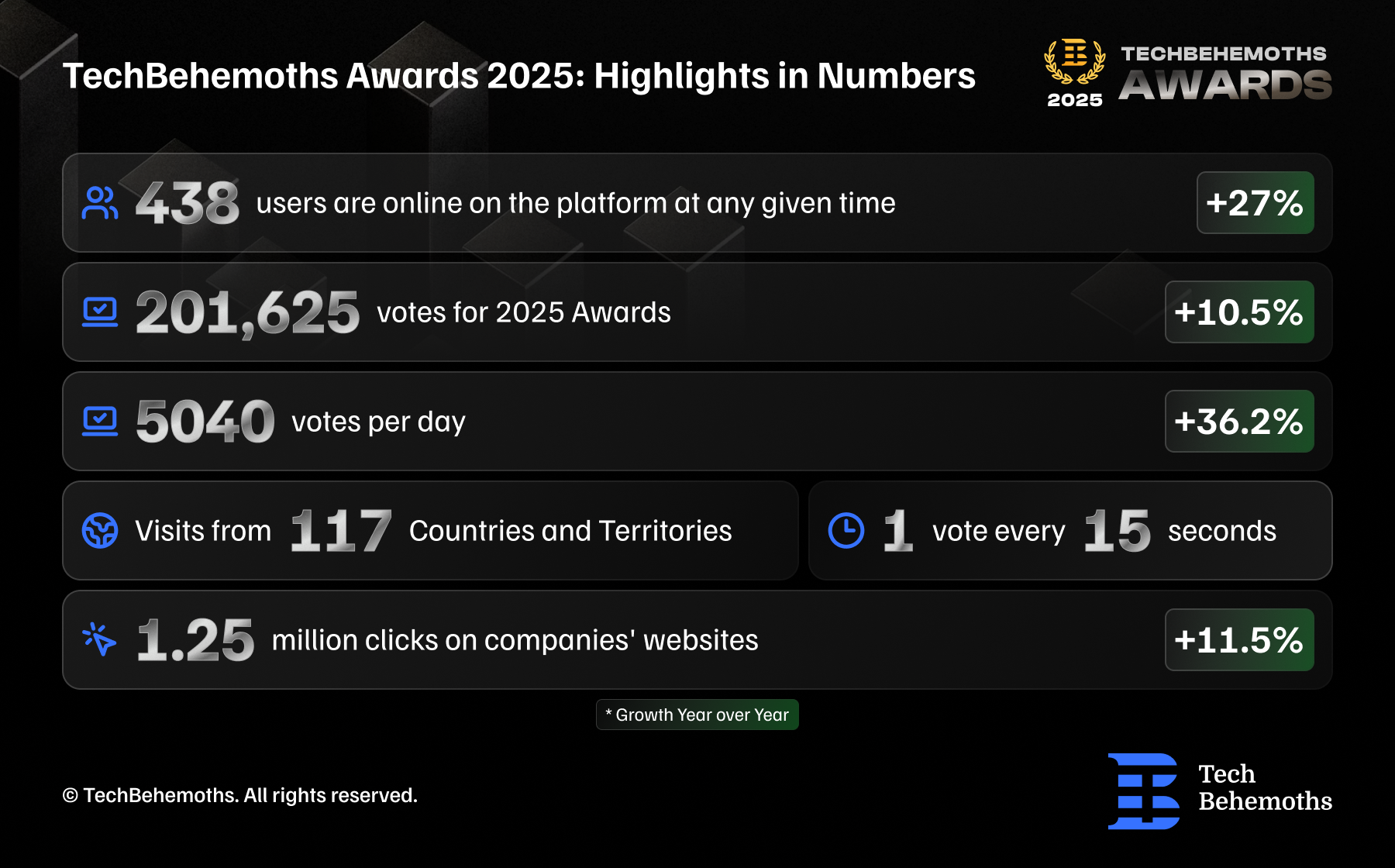 Throughout the TechBehemoths Awards 2025 period, the platform had an average of 438 active users at any given time, with visits from 117 countries and territories. In addition, over 1.25million clicks were directed to the company’s websites, which is a big impact.