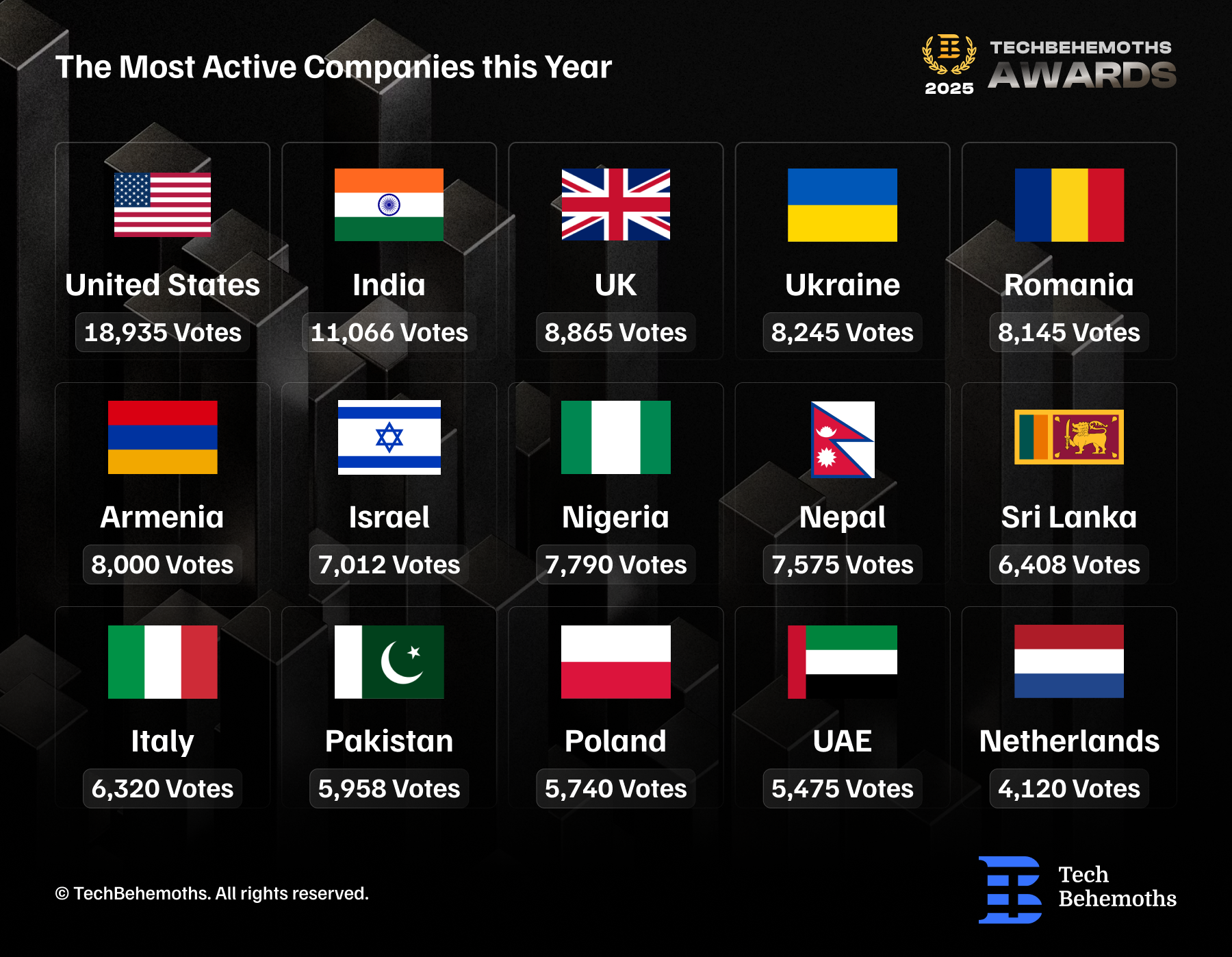 All these countries have well-developed tech industries with thousands of active, highly specialized, experienced, and competitive companies. Coupled with their strong presence and engagement on TechBehemoths' lead to more companies winning TechBehemoths Awards.