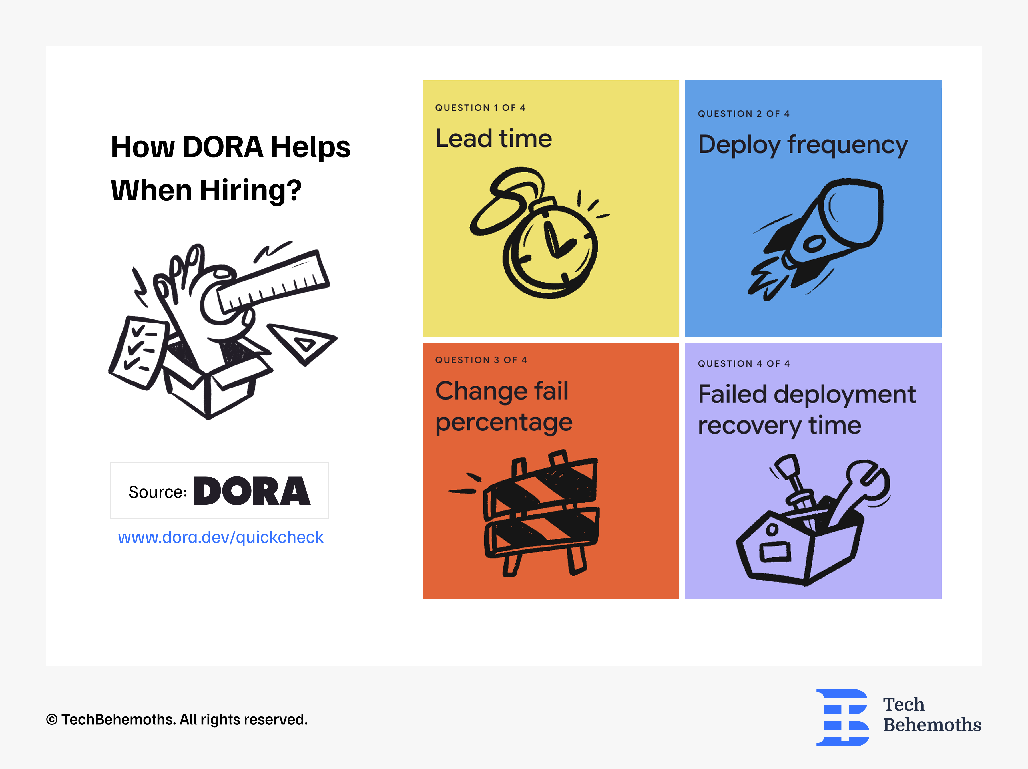 DORA focuses on how well a team delivers software, its speed, stability, and recovery. When evaluating a potential team, you can ask these 4 questions based on DORA 4 metrics:
