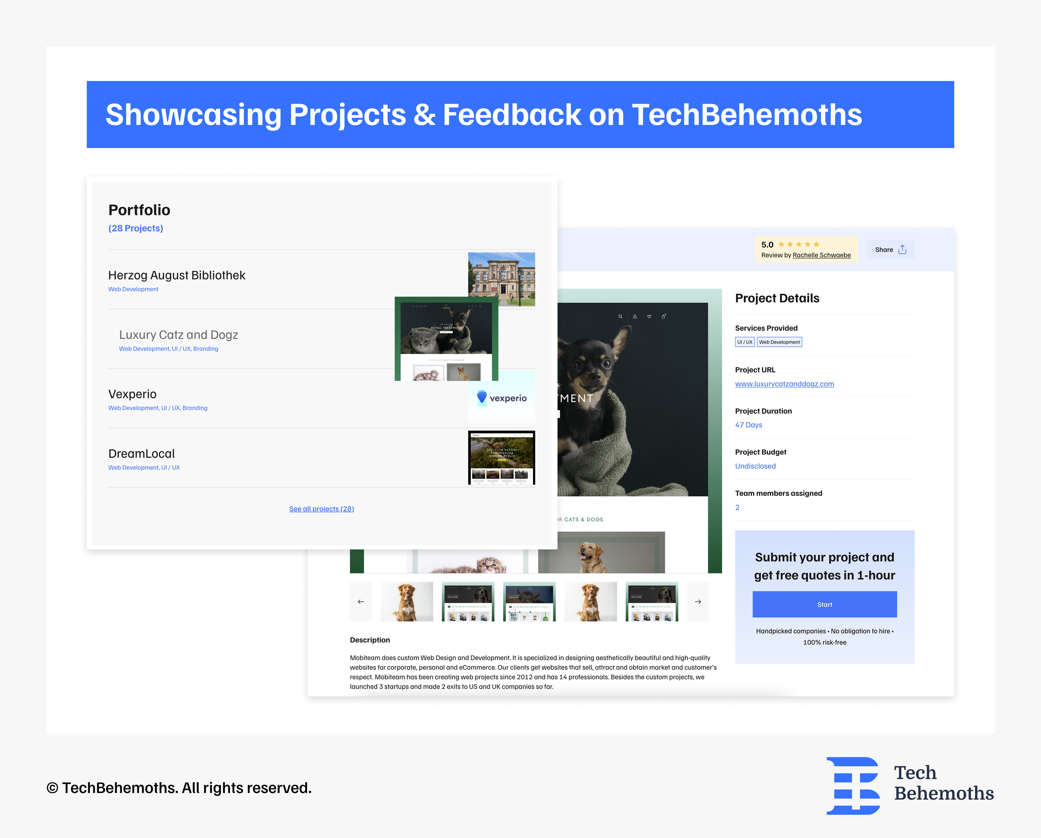 For example, on TechBehemoths, each company profile includes a “Portfolio” section where potential clients can explore completed projects, read authentic feedback, and get a clear sense of the team’s expertise. This makes it easier to evaluate their performance and build trust before starting a new collaboration.