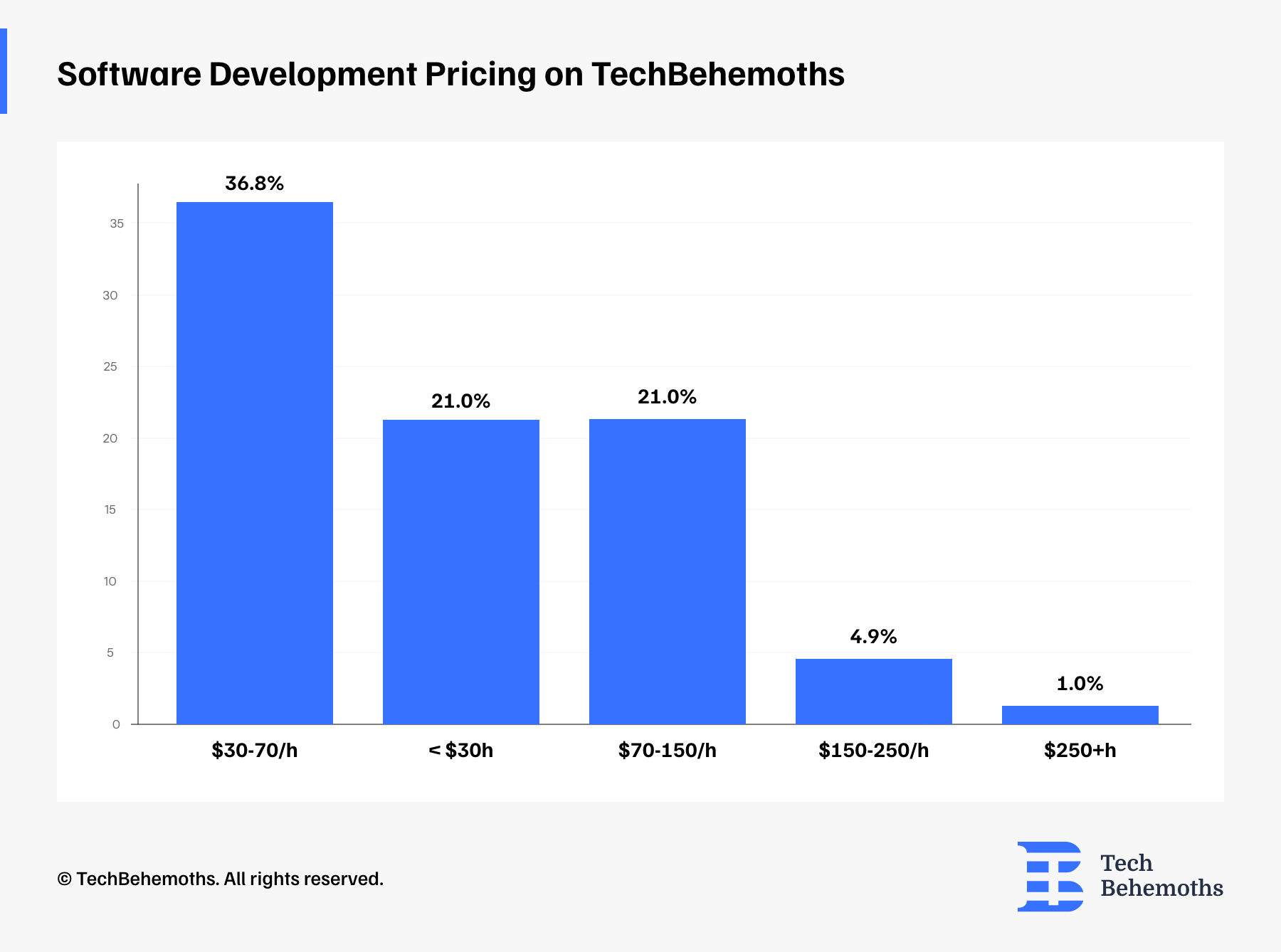 According to TechBehemoths, the most common price range is between $30 and $70 per hour, chosen by 36.8% of companies. Close behind, 21% of companies operate under $30 per hour. This segment typically includes entry-level to mid-level providers, small studios, or offshore teams.