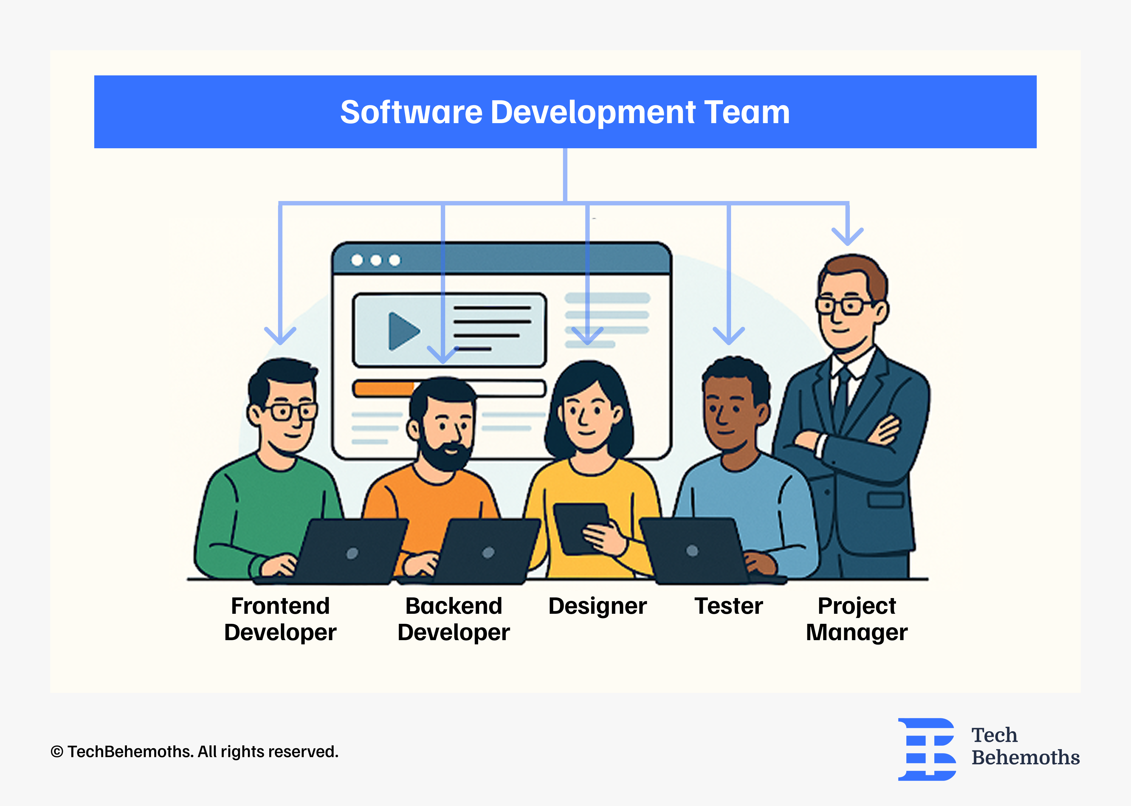 A software development team consists of experts who create software products (apps, web platforms, other digital systems). The team structure includes developers and designers and quality assurance engineers and project managers, and occasionally other domain experts. Each team member contributes to achieving successful software delivery that meets requirements and operates correctly.