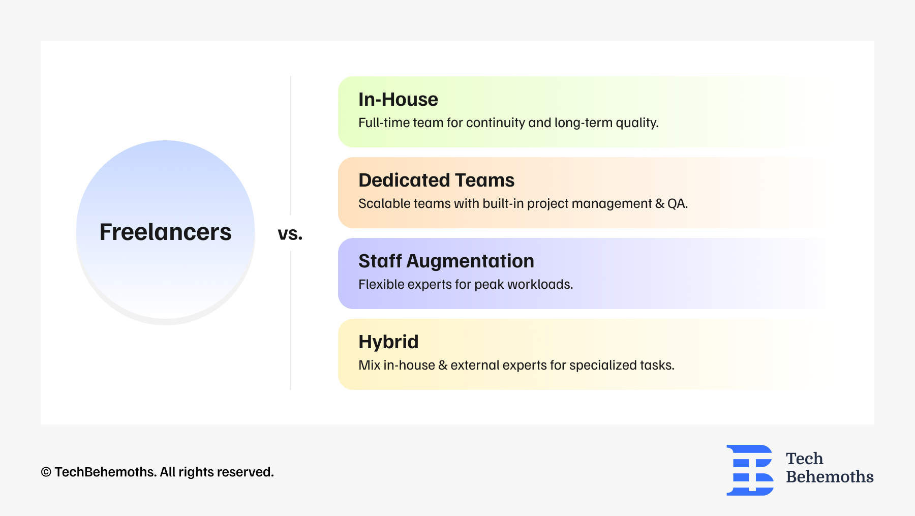 Key: All of these options offer stability, continuity, and better quality than a single freelancer, especially for critical projects, core products, or long-term development, so the company will need to make its choice primarily based on the project's duration and complexity, existing internal resources, costs, and scalability.