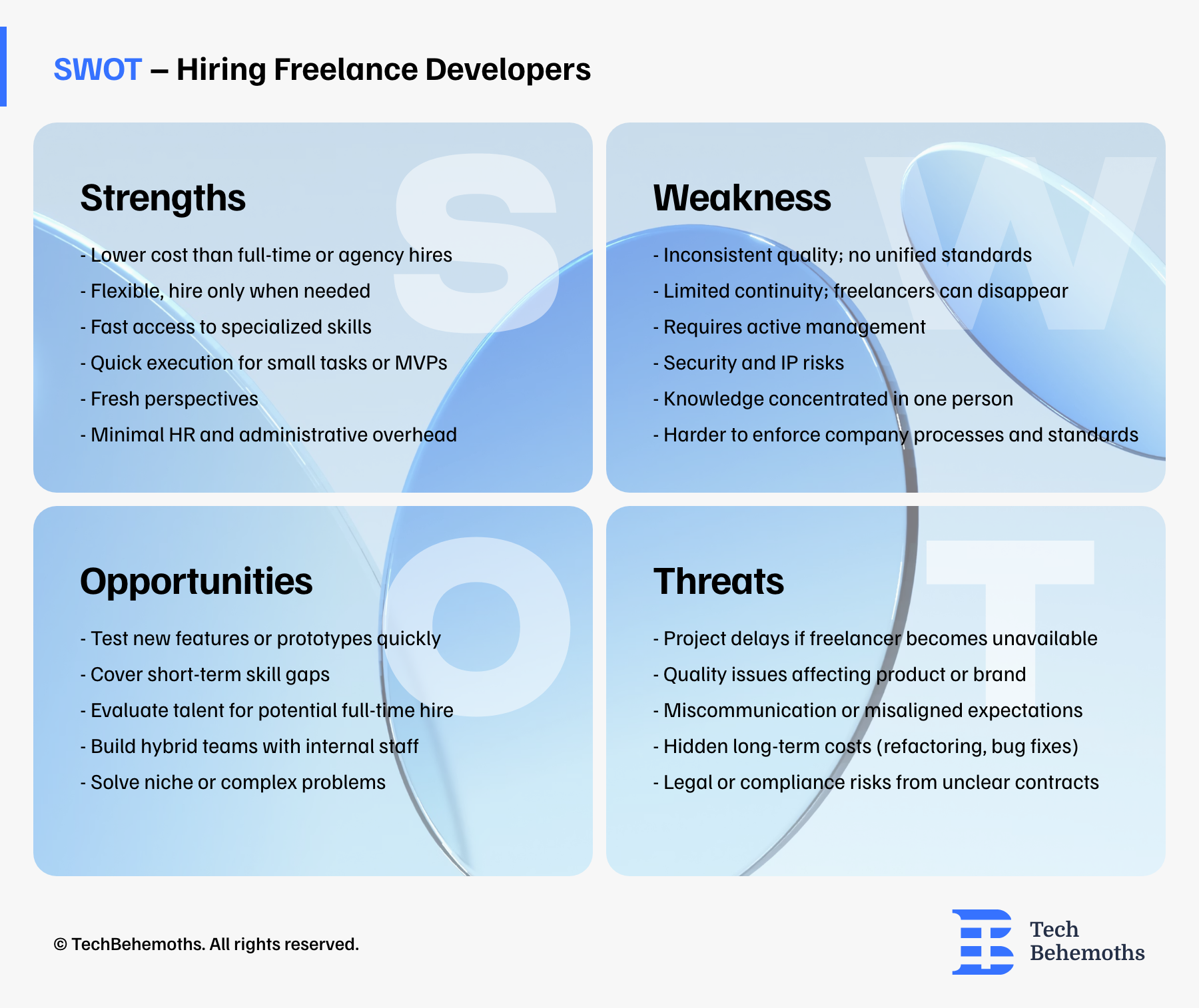 Based on the following SWOT analysis, we will more precisely define and structure what makes IT companies choose to hire freelance developers.